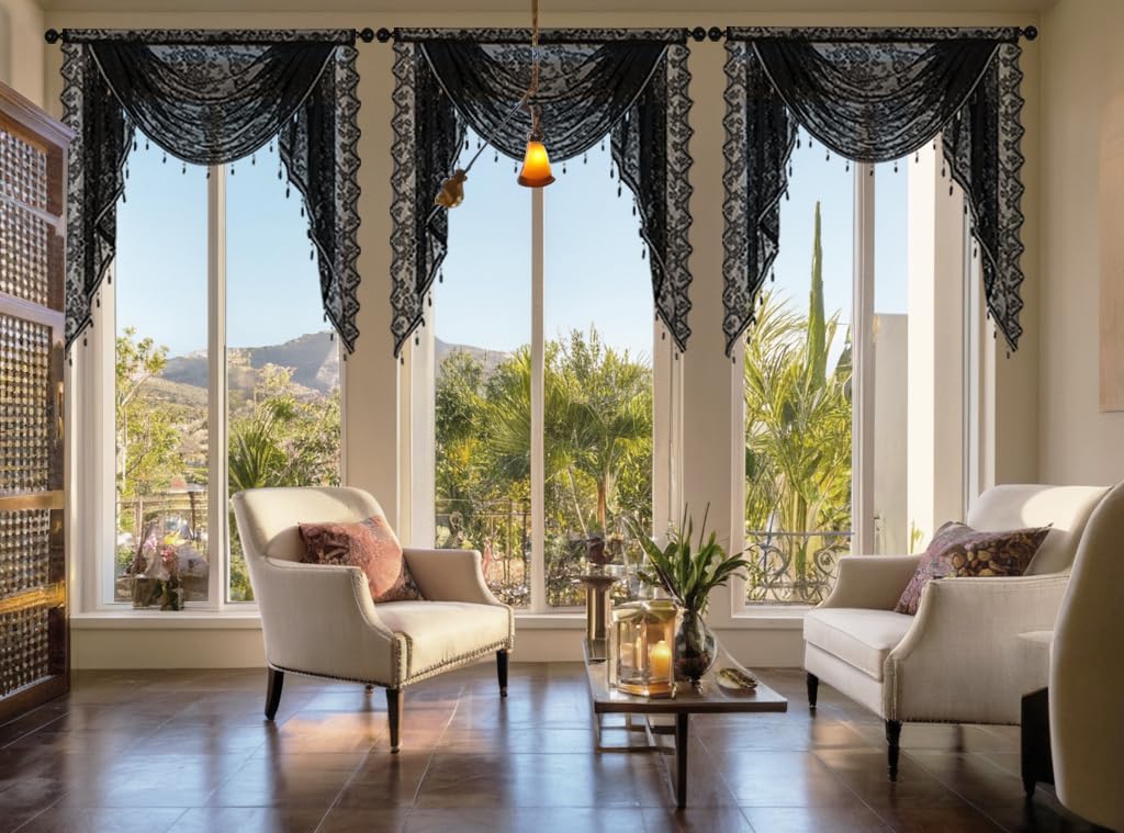 Huierxun Halloween Black Lace Waterfall Window Valance with Bead Tassels Floral Embroidered Valance Curtains Semi Sheer Rod Pocket Valance/Swags for Bedroom/Living Room/Kitchen/Basement(Black,39"x41")