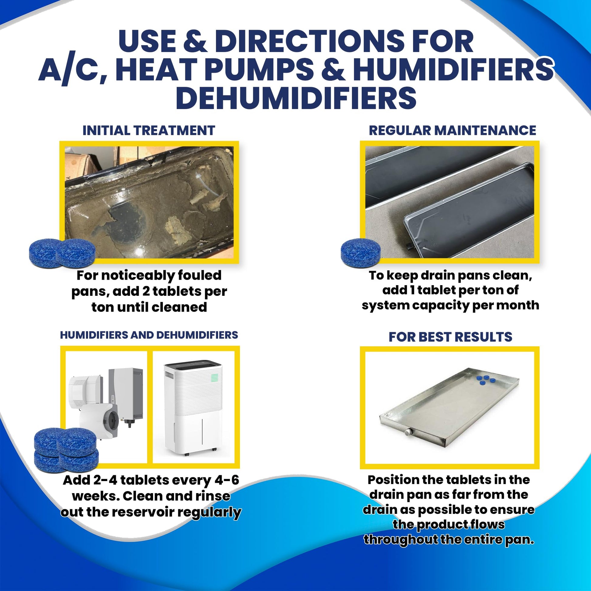 EFFORTLESS APPLICATION, LASTING RESULTS - Simply add one tablet per ton of system capacity monthly for hassle-free maintenance. For visibly fouled AC drip pans, use 2 tablets per ton (repeat until cleaned). For best results, place tablets farthest away from the drain to let the condensate spread the solution. Humidifiers benefit from 2-4 tablets every 4-6 weeks, with regular reservoir cleaning for peak performance