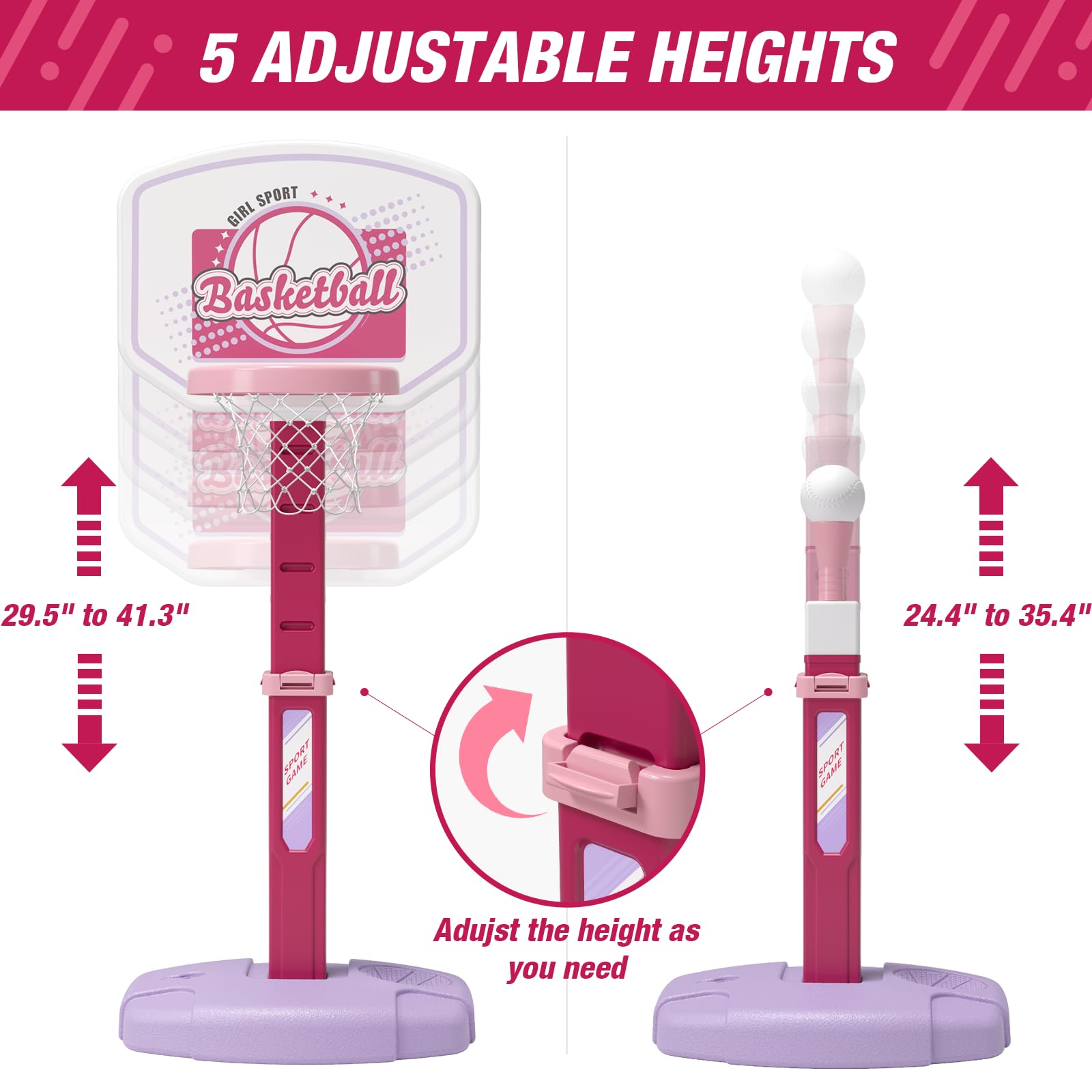 HYES 2 in 1 Kids Basketball Hoop and T Ball Set - Adjustable Height, Kids Baseball Tee with Automatic Pitching Machine, Indoor Outdoor Sport Toys Gifts for Toddler Boys Girls Age 1-5, Pink