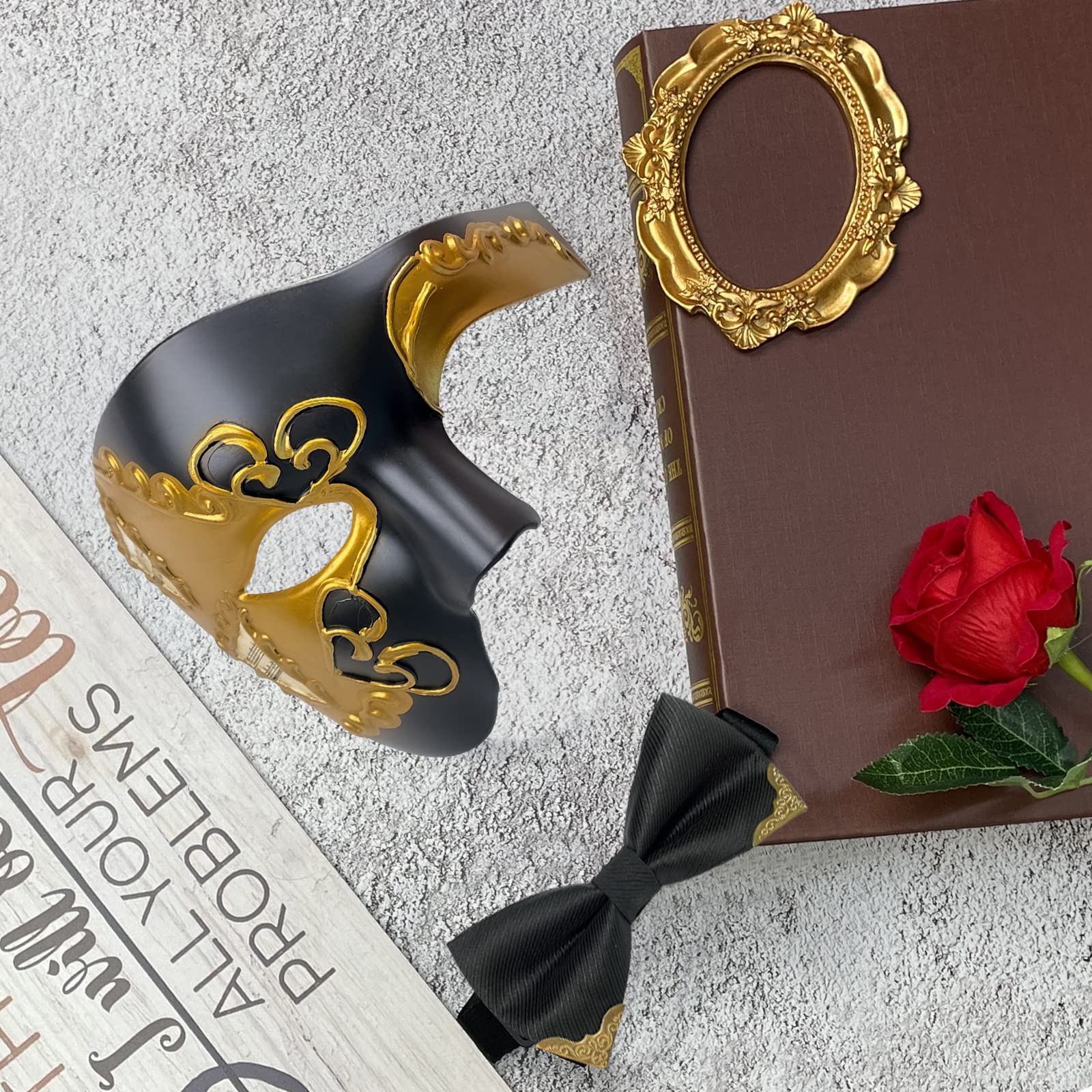 • Phantom of the Opera Mask: Inspired by the famous Phantom of the Opera character, this masquerade mask covers half of your face and bring an element of mystery to your look. Vintage masquerade mask men matched with a delicate bowtie make your style more unique, elegant. Men's phantom mask with bowtie will add a lot of points to your dress.