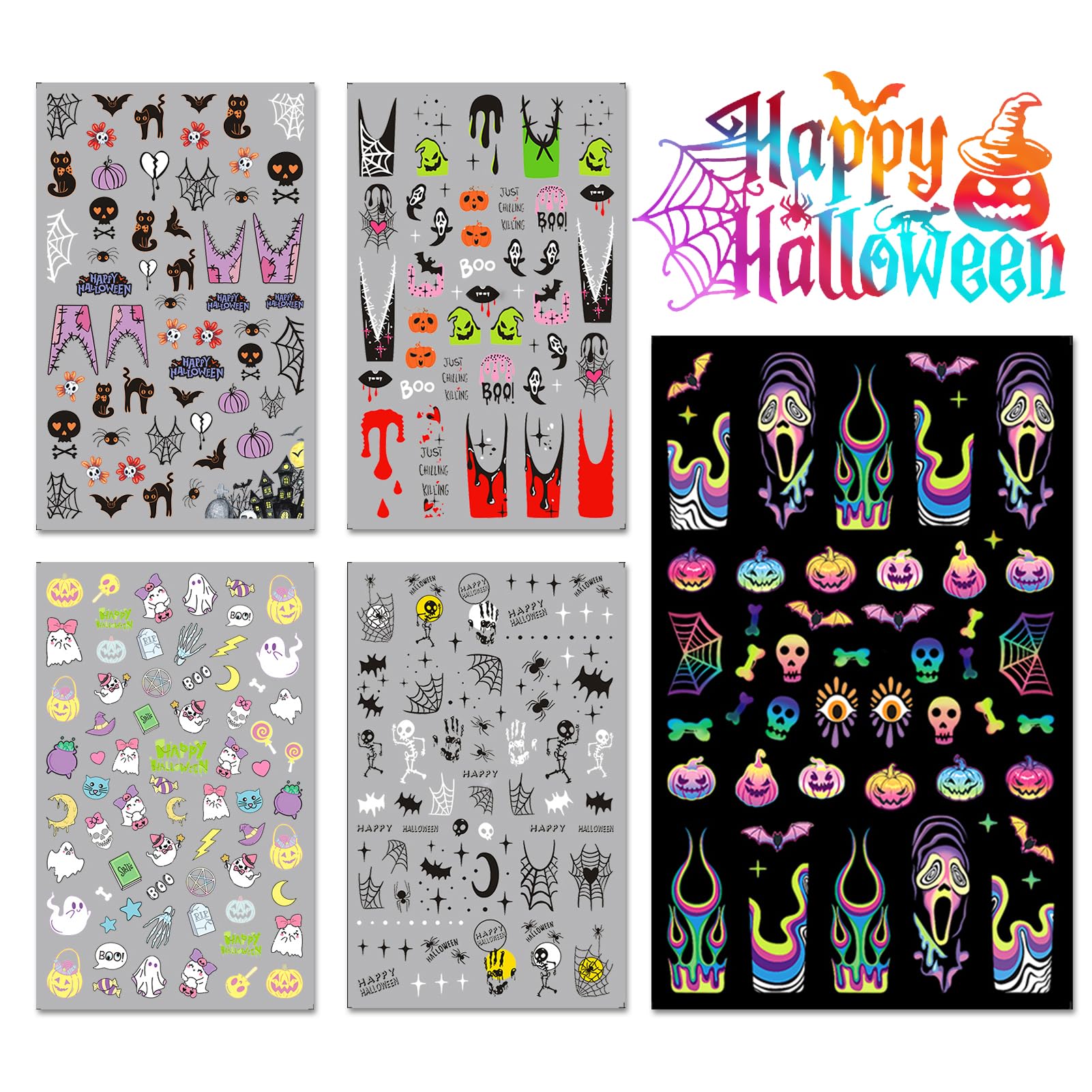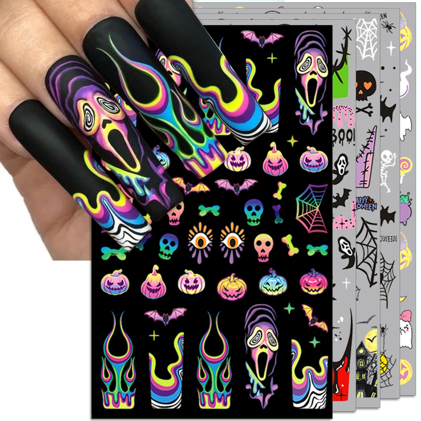 IDDFEVE Halloween Nail Art Stickers, Gradient Pumpkin, Horror Mask Nail Decals, 3D Self-Adhesive Spider-Web Bat Design for DIY Nail Supplies Decoration (5 Sheets)