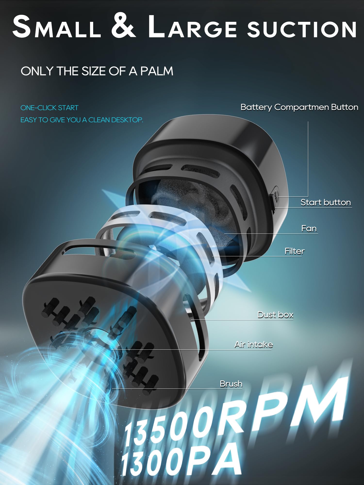 • 【One Key Switch Operation】Your Table Vacuum Cleaner is very easy to operate. Suitable for students and elderly. It is Portable and Cordless.You just hold it by your hand and move it.Our table cleaner will save from the annoying little mess in life and clean all around your home and car.