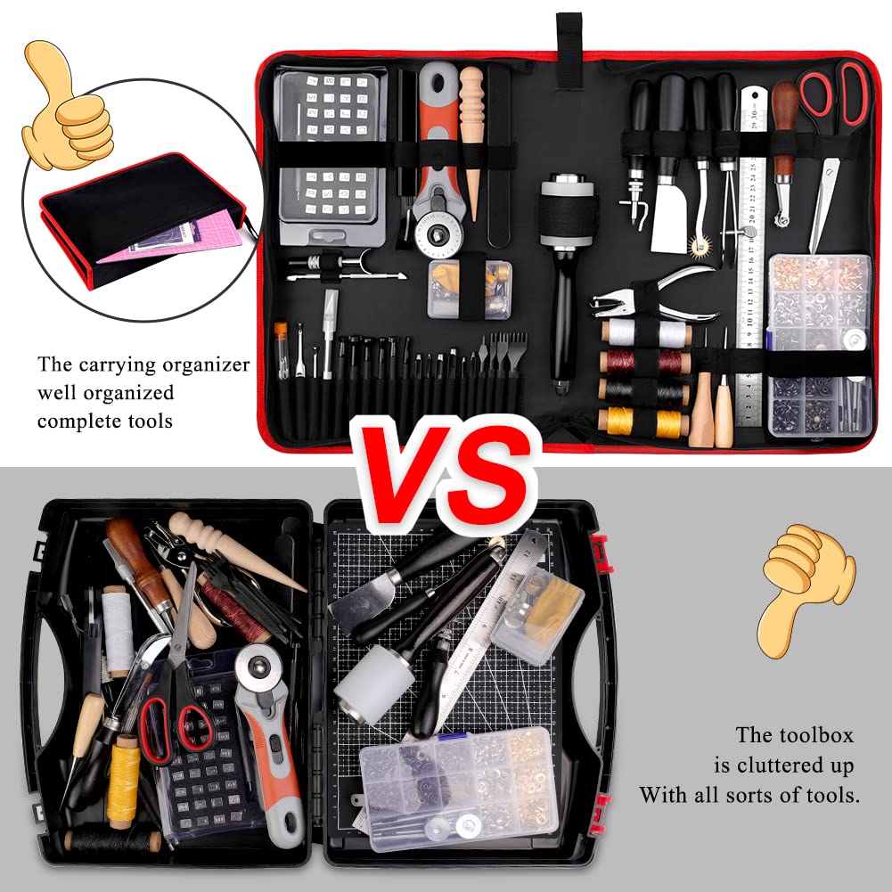 • Leather Working Kit: Our 415 Pcs leather working tools store well organized in the high-quality leather tools storage bag, neatly arranged, includes leather carving tools, edge beveling tools, cutting tools, punching tools, and other useful leather working and sewing tools supplies, they are randomly placed, very friendly for beginners to get this complete entry-level leather kit and start his leather making journey immediately