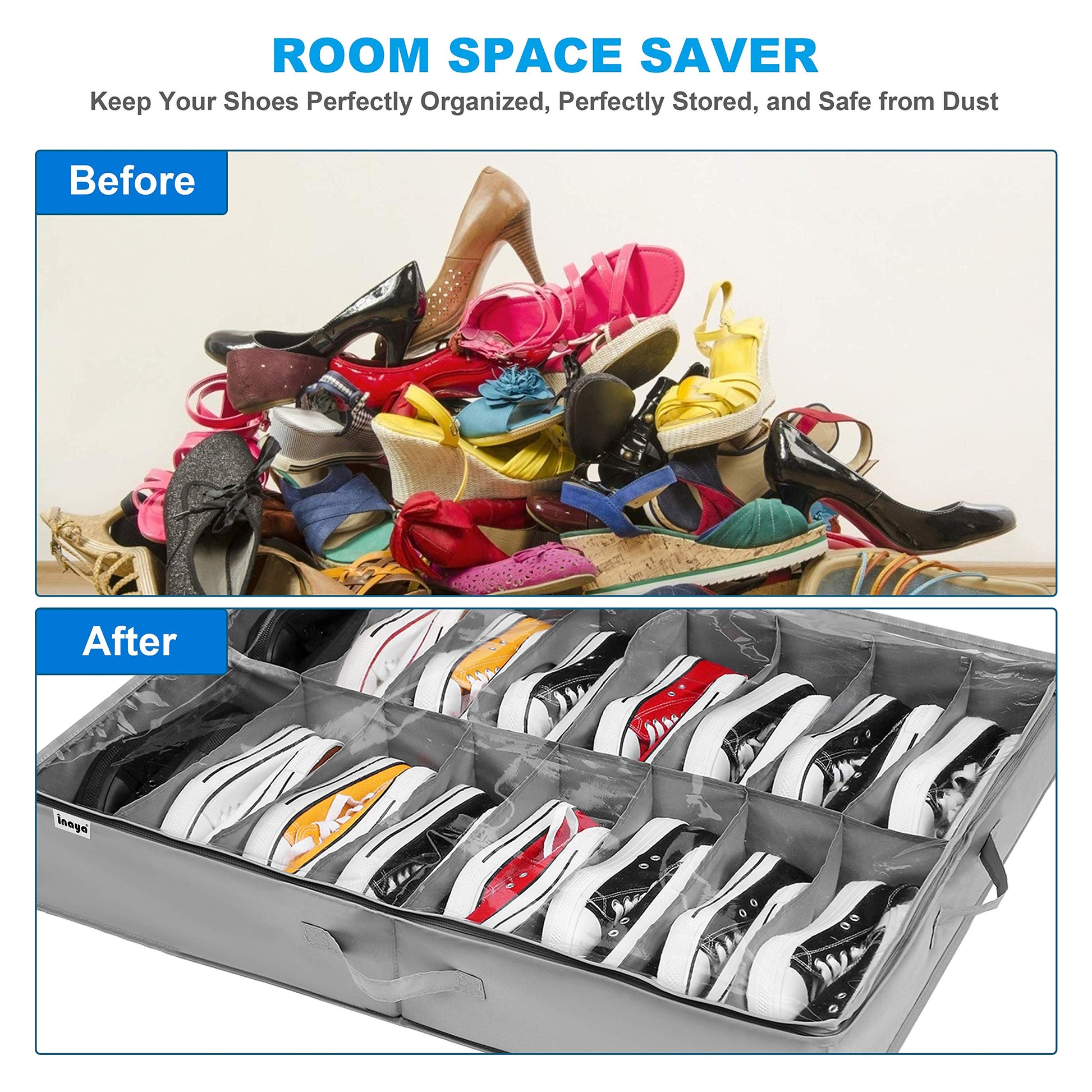 • ✔️SIMPLE SHOE STORAGE SOLUTION - Shoe racks are nice, but they neither fit so many pairs of shoes nor Dust-proof. The trick to an organized home is making the most of small unused spaces. Use this shoe organizer to store 32 pairs of shoes under your bed. This shoes storage is the ideal solution for any woman with a shoe addiction or moms with too many kids shoes flying around the house.