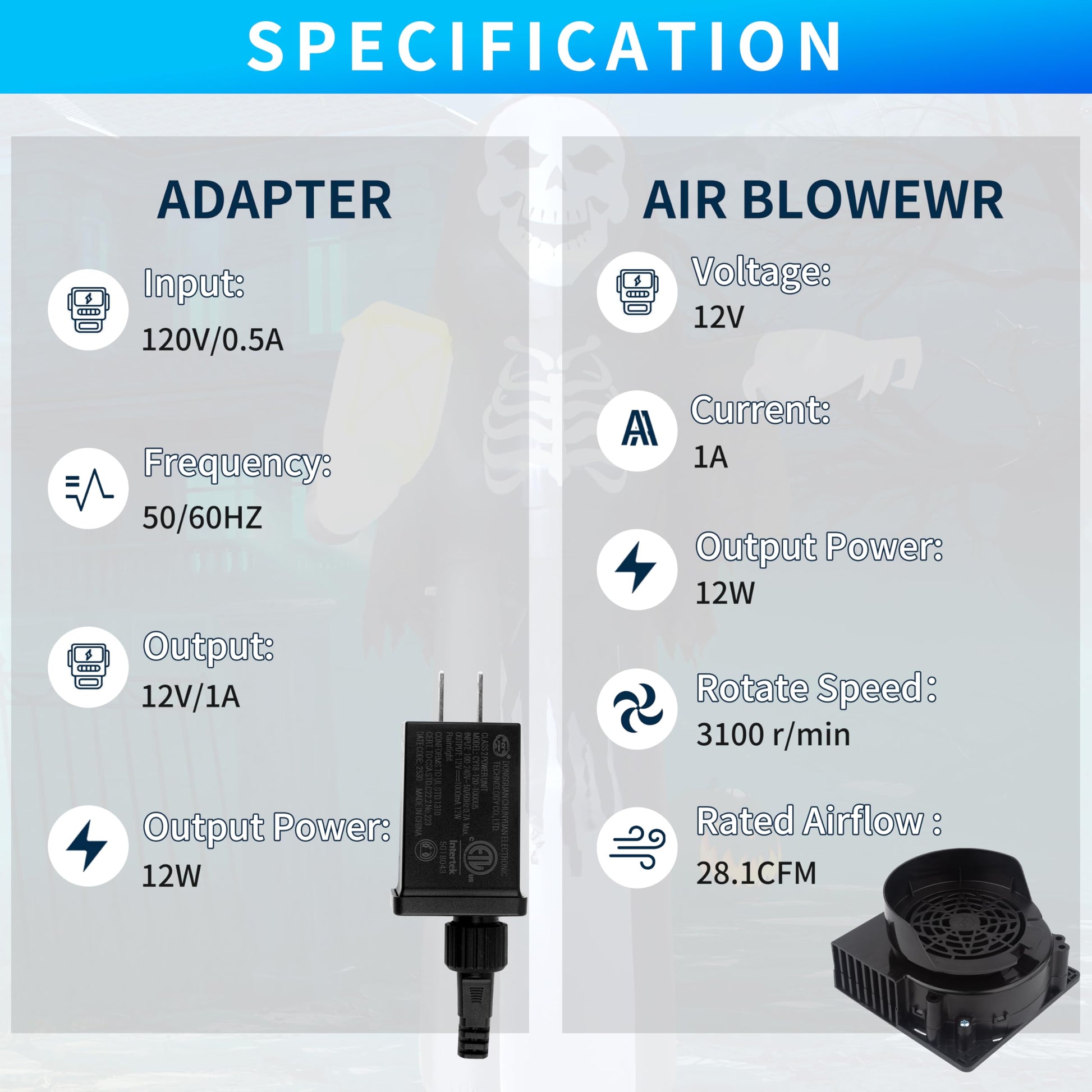 • Specification: Output: 12V 1A adapter; Output: 12V 1A fan blower; Rated Airflow: 28.1 CFM; Suitable for Tall:4-5FT,Dia: 2-6FT inflatable decoration; Tall:6-7FT,Dia: 2-5FT inflatable decoration; Tall:8-9FT,Dia: 2-4FT inflatable decoration