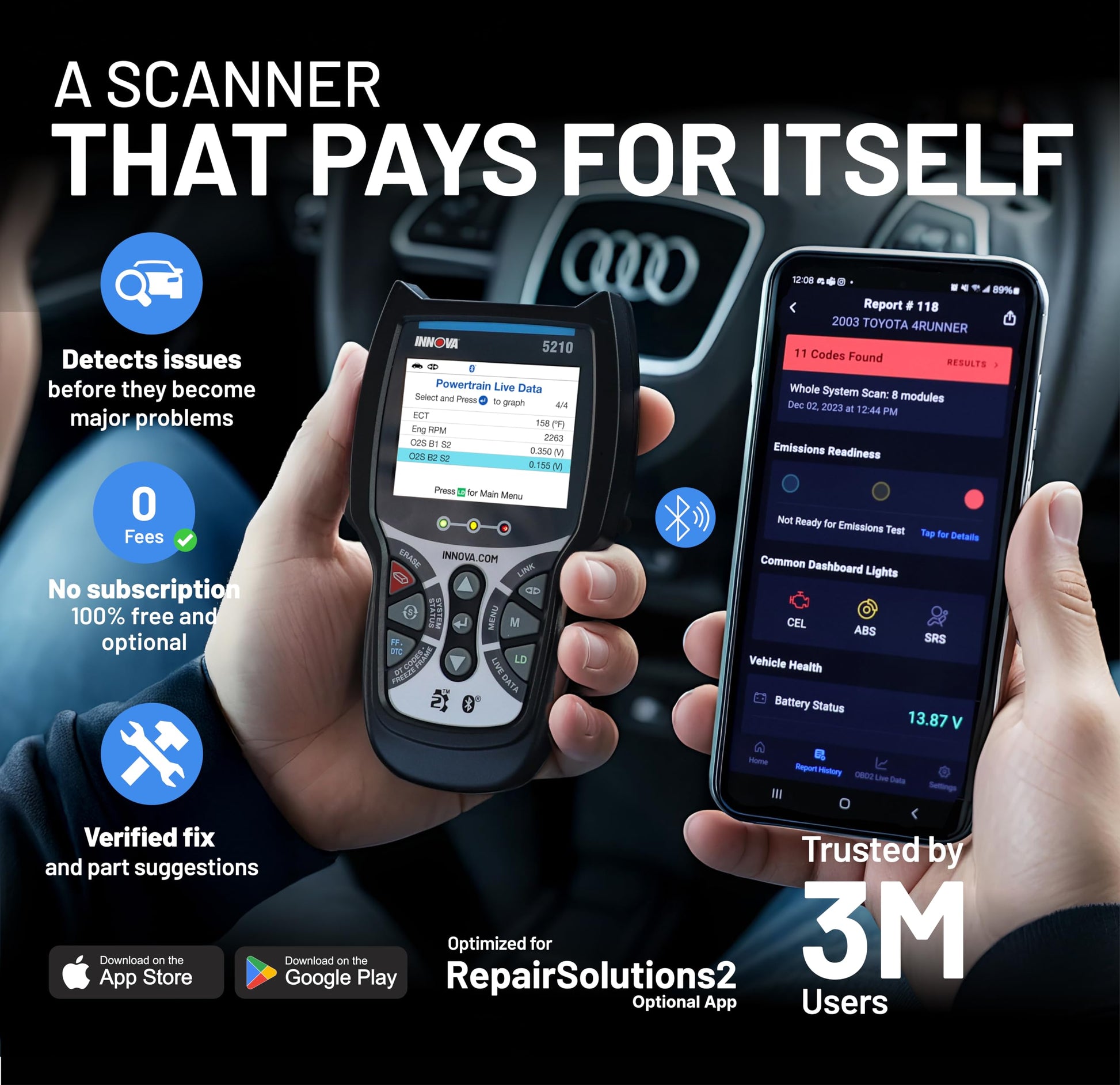 • NO SUBSCRIPTIONS – VERIFIED FIXES WITH FREE APP – Unlike other OBD2 code readers, the INNOVA 5210 provides verified fixes based on real-world repairs from ASE-certified mechanics. Trusted by 4M users, the RepairSolutions2 app on iPhone & Android gives you step-by-step repair guidance, suggested parts, and cost estimates—no extra fees or hidden subscriptions!