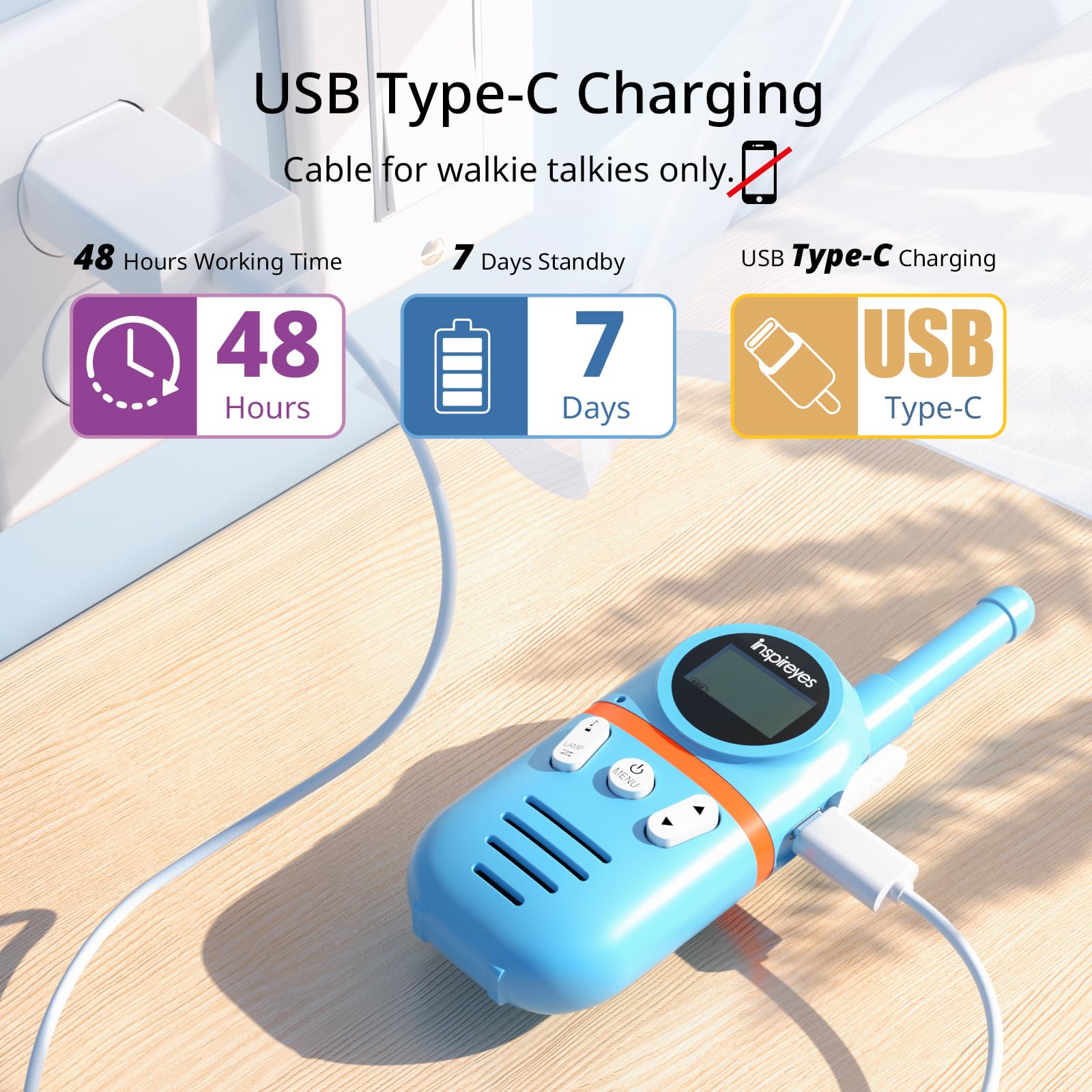 • Inspireyes rechargeable kids walkie talkies are rechargeable and long lasting, featuring an upgraded built-in lithium polymer battery. There is no need to buy extra AAA batteries. Kids can enjoy up to 48 hours of playtime and 7 days of standby on a single charge.