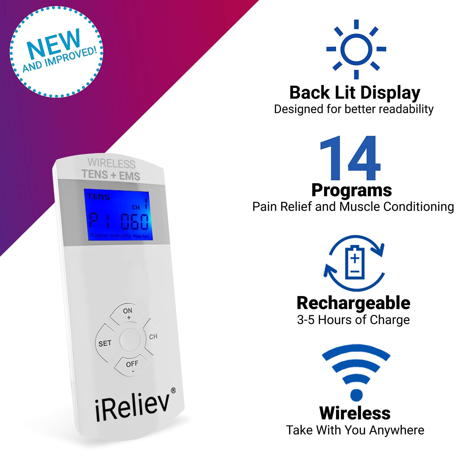 iReliev Wireless TENS + EMS Therapeutic Wearable System Wireless TENS Unit + Muscle Stimulator Combination for Pain Relief, Arthritis, Muscle Conditioning, Muscle Strength