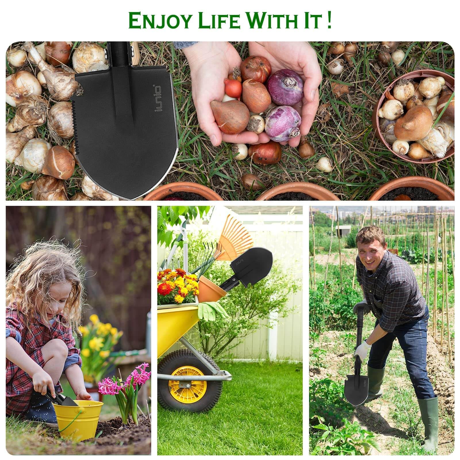 • Sturdy & Built to Last: iunio camping folding shovel blade and handle are made of high-carbon steel which is high-strength and wear-resistant. The grip on the handle is made of rubber and this shovel has passed the durability tests and our destruction tests