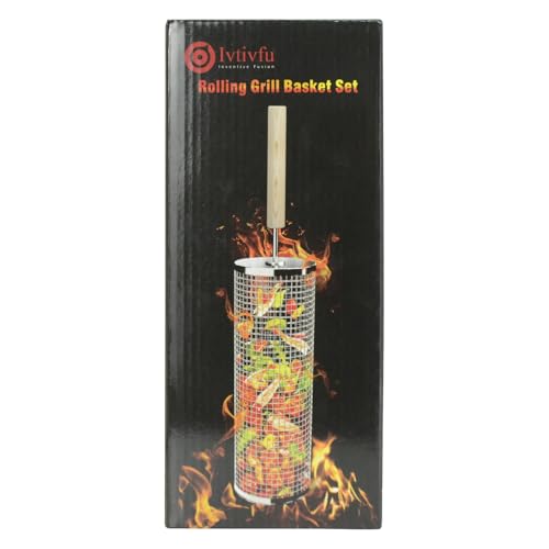 ivtivfu Rolling Grill Baskets, Removable Wooden Handle, 304 Stainless Steel, Nesting Grilling, BBQ Accessories Tools for Vegetable Shrimp, Outdoor Cooking Camping, Birthday Gifts for Men Dad Husband