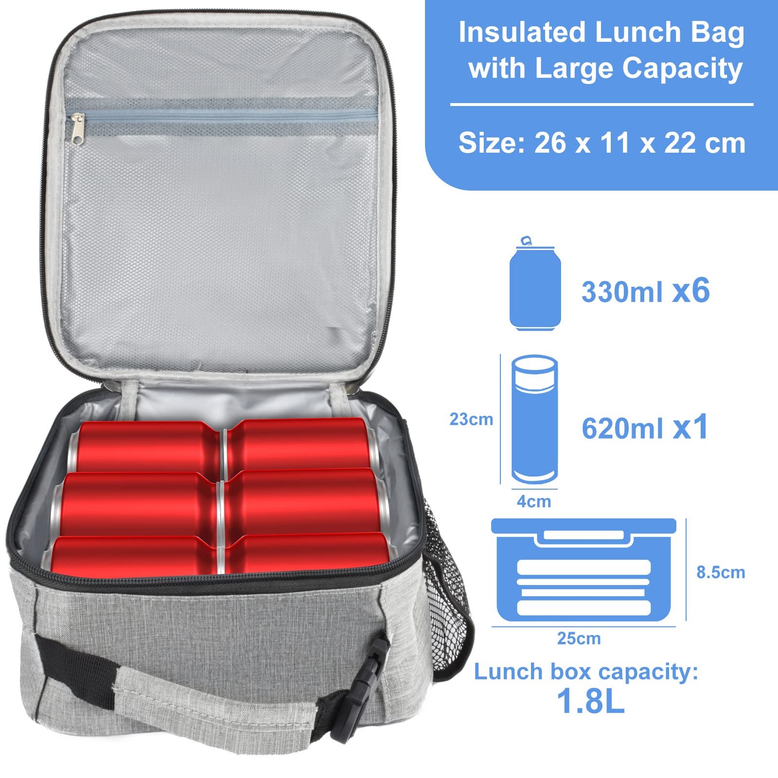 • Easy to Carry: the size of the lunch bag: 10.2' L x 4.3' W x 8.6' H, suitable for 6 cans or 1 person lunch. With a detachable buckle/handle, it can be tied to any backpack and suitcase, making it an ideal lunch bag for work, office, school and travel, suitable for men, women, boys and girls.
