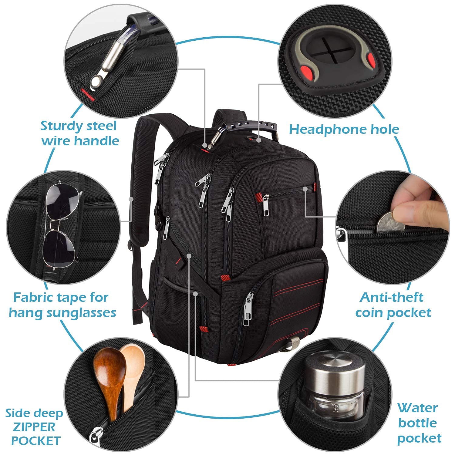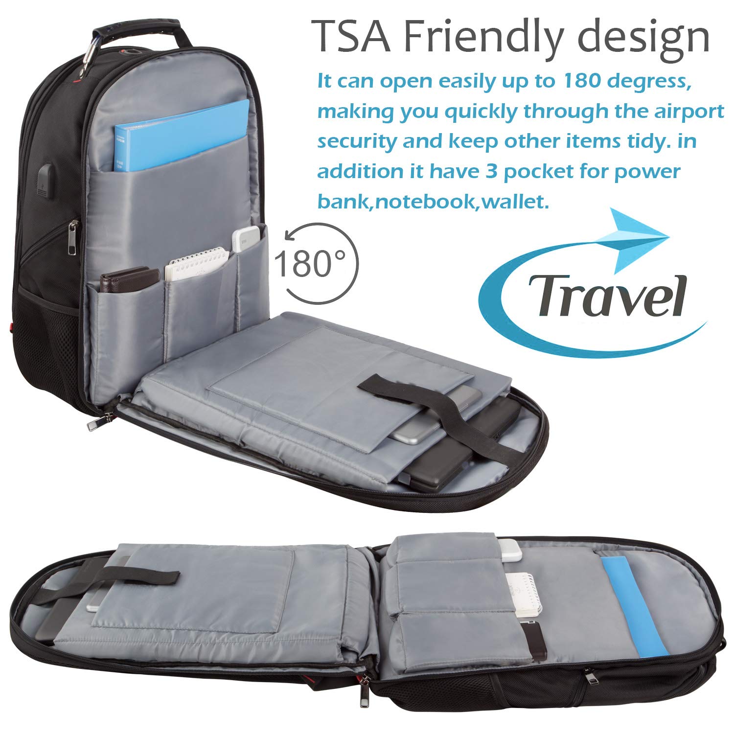 TSA Friendly: Quick access laptop compartment fits 17-inch laptops/notebooks, allows you open your backpack quickly at airport security checkpoint, ensures a without hassle laptop-in-bag TSA scan. Great present for airplane travellers. With charger port: USB Charger port is a convenient external connection, it offers an easy access to charge your devices. Hook up your phone and be on the go. A HOLE for HEADPHONES: Listen to music on the go hands relax. Extra Zippered Pouches at sides: For your utensils, napkins or other little items. Two side mesh pockets: Water bottle, umbrella. Friendly Heads-up:An anti theft pocket and luggage sleeve is designed on the back. Suitcase strap can secure laptop backpack tightly on suitcase
