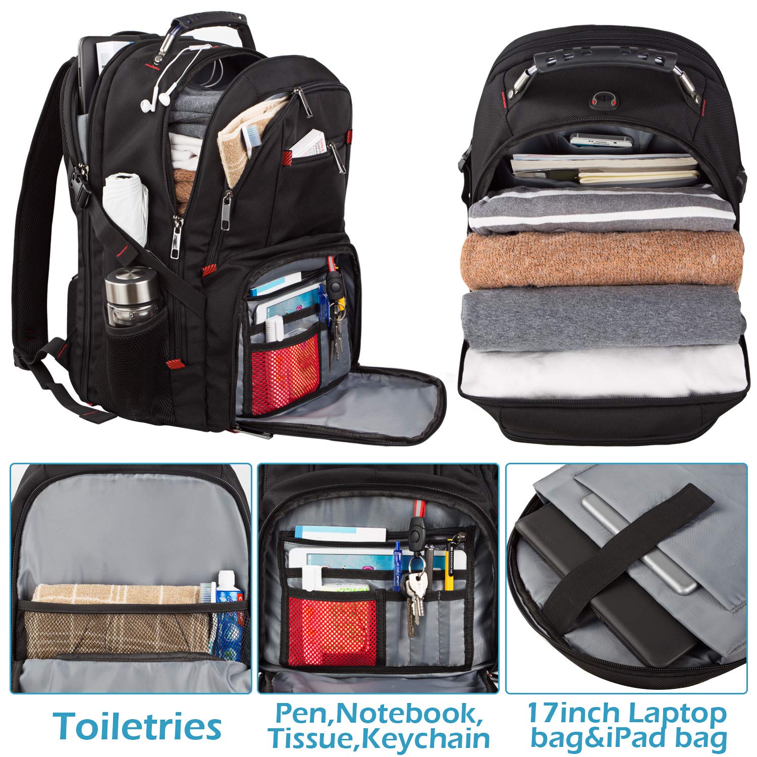LARGE CAPACITY & ORGANIZED: Men travel backpack owns 20+ Independent multi pockets with classic style for large storage and organization. extra large size 19.0*14.6*10.2 (inches), Capacity:45L, spacious main multi compartments with 2 anti theft zipper and many hidden pockets can accommodate lots of accessories, like clothes, small blanket, cellphone, wallet, stationery, notebook, keys,coin; 2 side larger deep ZIPPER POCKET for easy access essentials like toothbrush,toothpaste.2 side elastic net