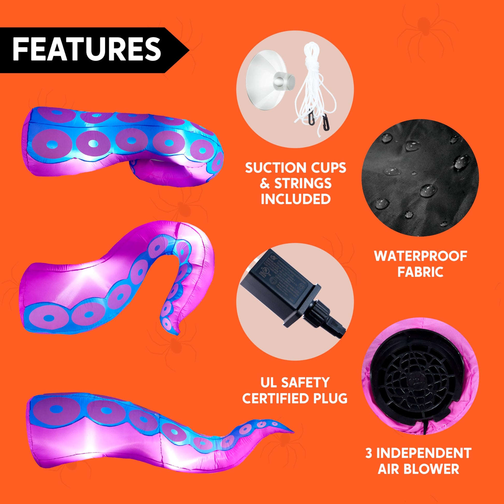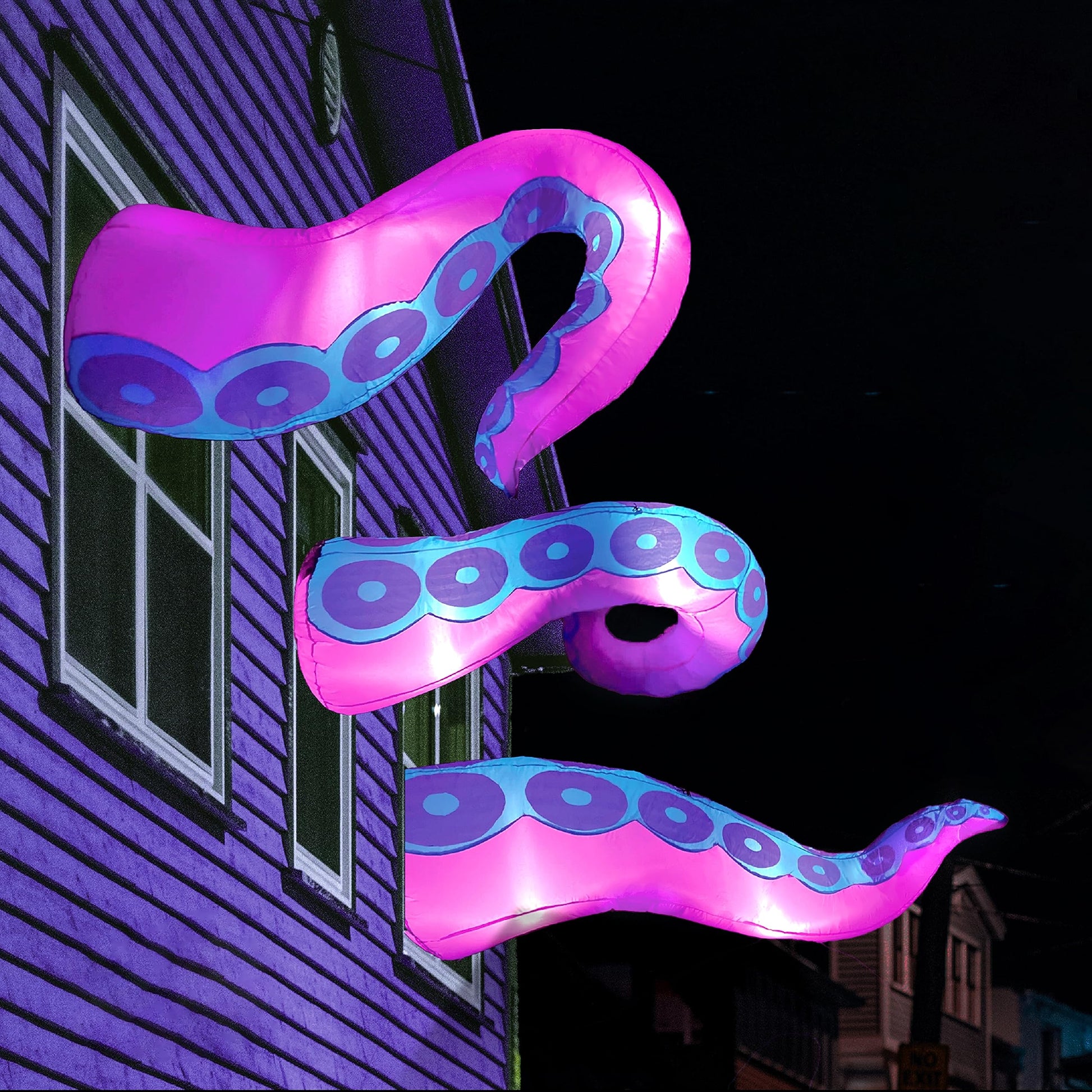 • Perfect Design. This Halloween inflatable octopus tentacle decoration has stunning visual effects, making it an unmissable centerpiece for your Halloween party. Including 4.5 ft, 5 ft, 6 ft long large tentacles. This inflatable comes with an extended cord,suction cups, fastened ropes, and a plug with UL certification.