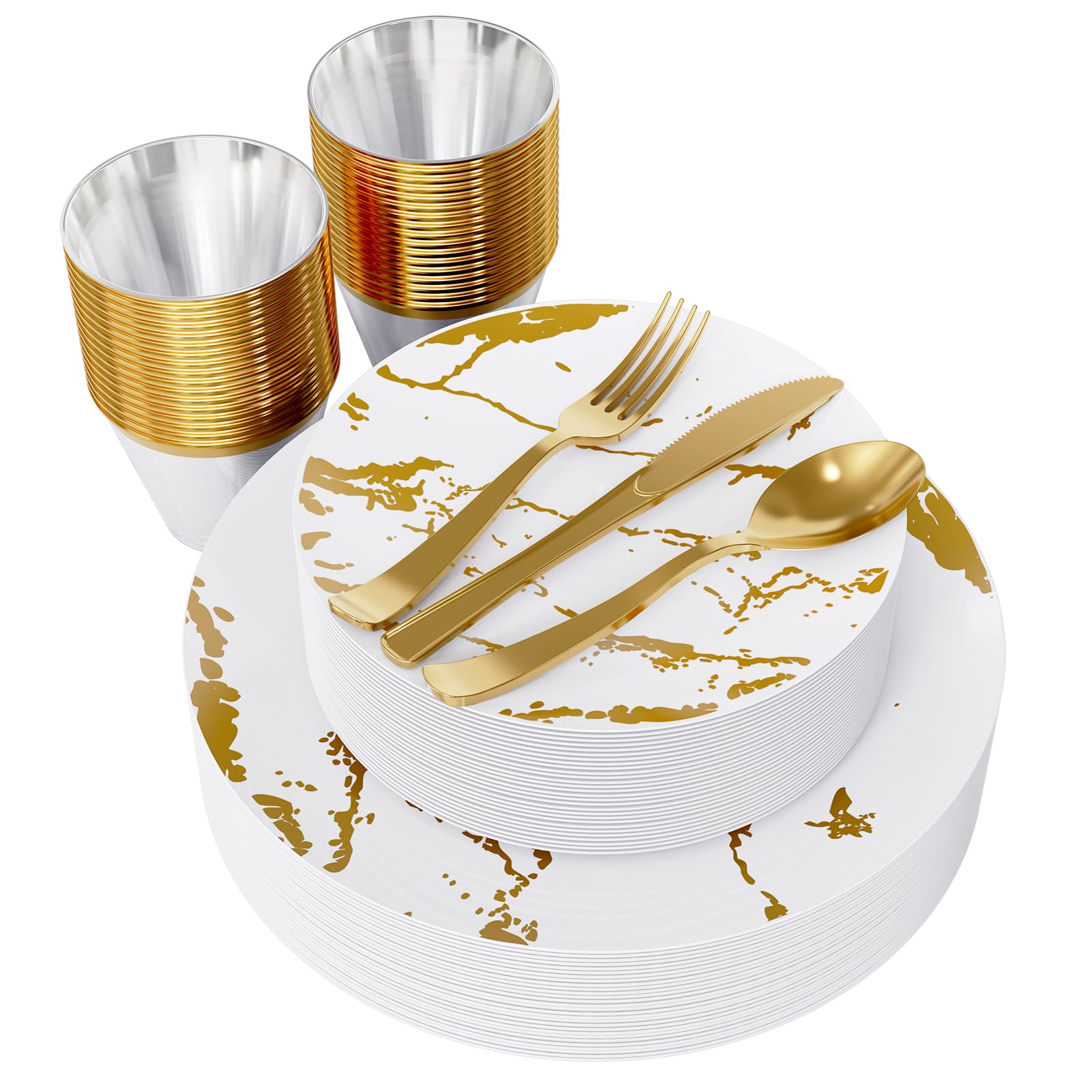 • 【30 GUESTS DINNERWARE SET】This white and gold plastic tableware set includes 30 dinner plates, 30 dessert plates, 30 forks, 30 spoons and 30 knives, 30 cups. everything you’ll need for the complete party planning experience