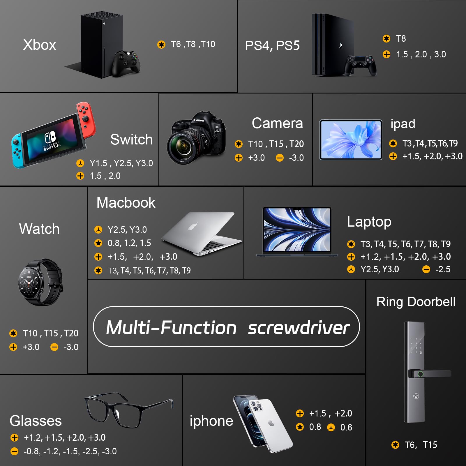• 【32-In-1 Precision Screwdriver Set】 Includes: Philips PH000 (+1.2) PH000 (+1.5) PH00 (+2.0) PH0 (+3.0); Flathead -0.8 -1.2 -1.5 -2.5 -3.0; Torx T1 T2 T3 T4 T5; Torx Security TR6 TR7 TR8 TR9 TR10 TR15; Tri-point Y000 (Y0.6) Y00 (Y1.5) Y0 (Y2.5) Y1 (Y3.0);Pentalobe P2(0.8) P5(1.2) P6( 1.5); Hex H1.5 H2.0 H2.5 H3.0; MID 2.5.