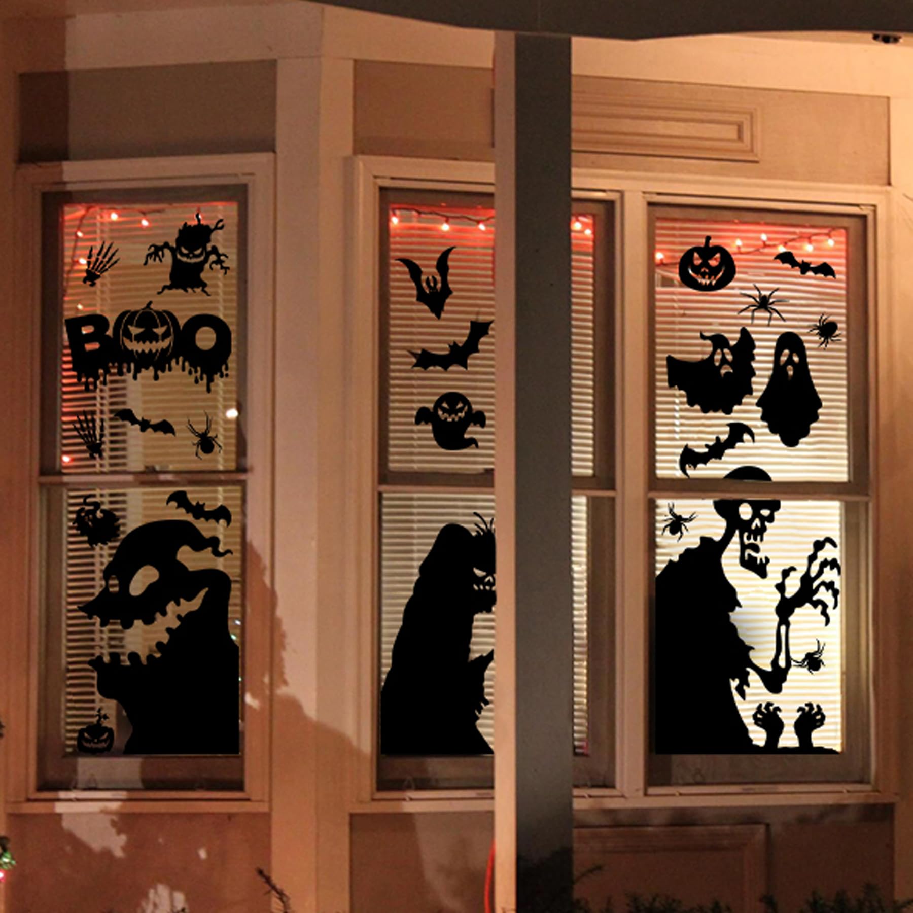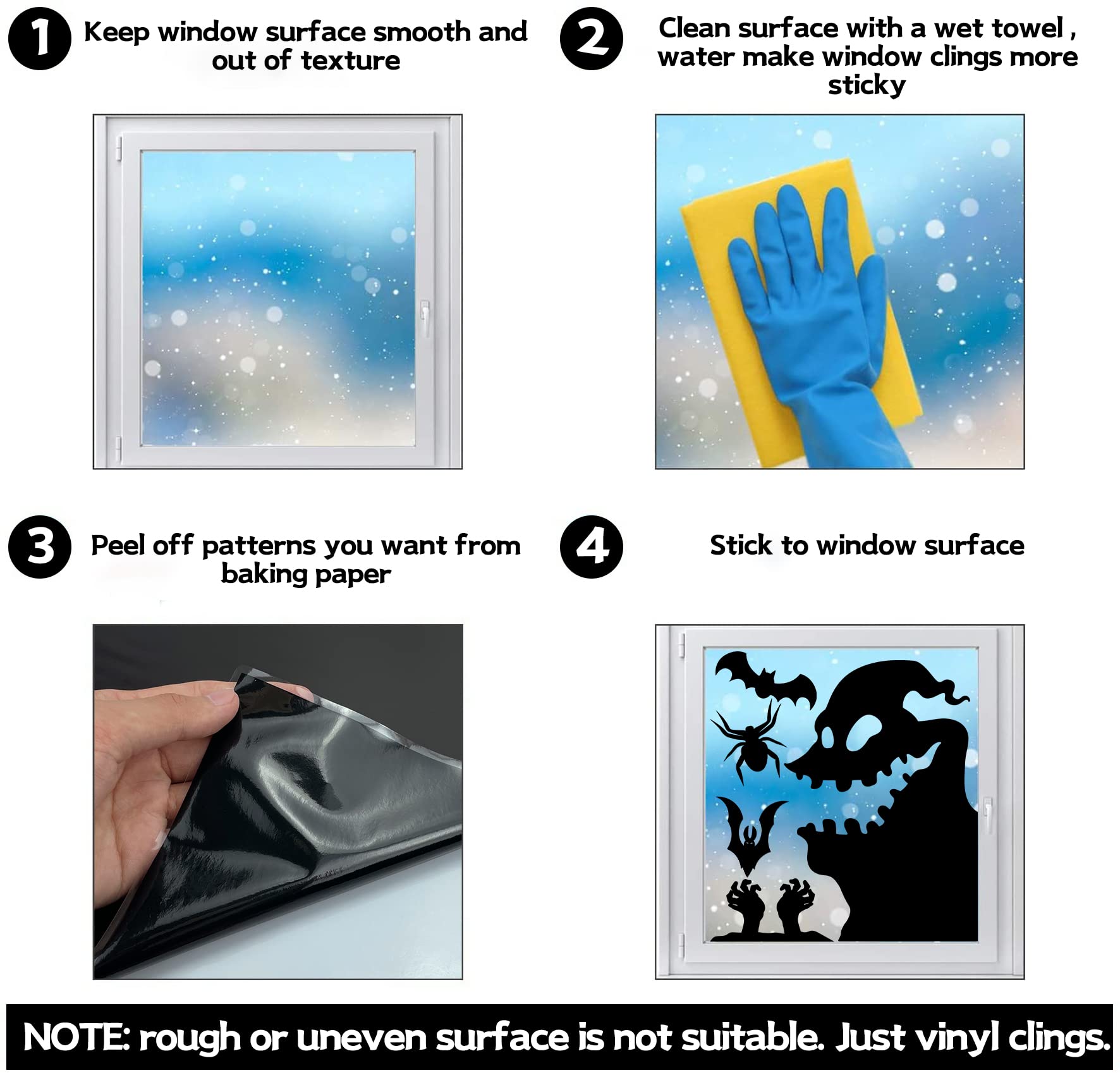 • EASY TO USE: First, wipe the window with wet towel to make it clean and wet. Second, peel the window clings from the sheets and apply the window clings to your windows, Third, remove the bubbles carefully, These window silhouette are easy to put on and take off, no adhesive and glue, These spooky window ckings can be reused