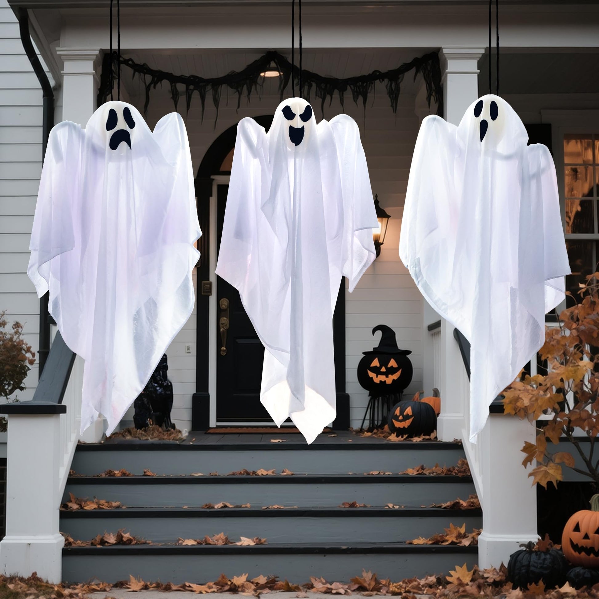 • SUPER VALUE PACK. Add a cute and spooky atmosphere to your Halloween with our flying ghost halloween decoration. You will get 3 Pcs white hanging ghosts with different spooky faces.