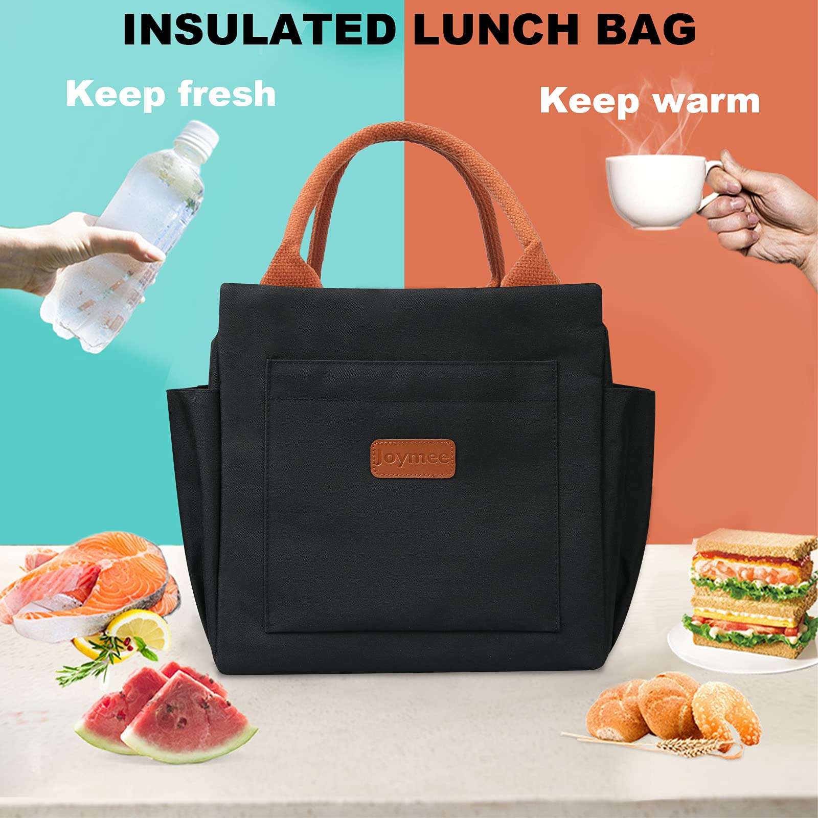 Joymee Lunch Bag Women Insulated Lunch Box Reusable Leakproof Large Spacious Cooler Tote for Women Men Adult with Bottle Holder and Side Pockets for Work Office Travel Picnic - Black