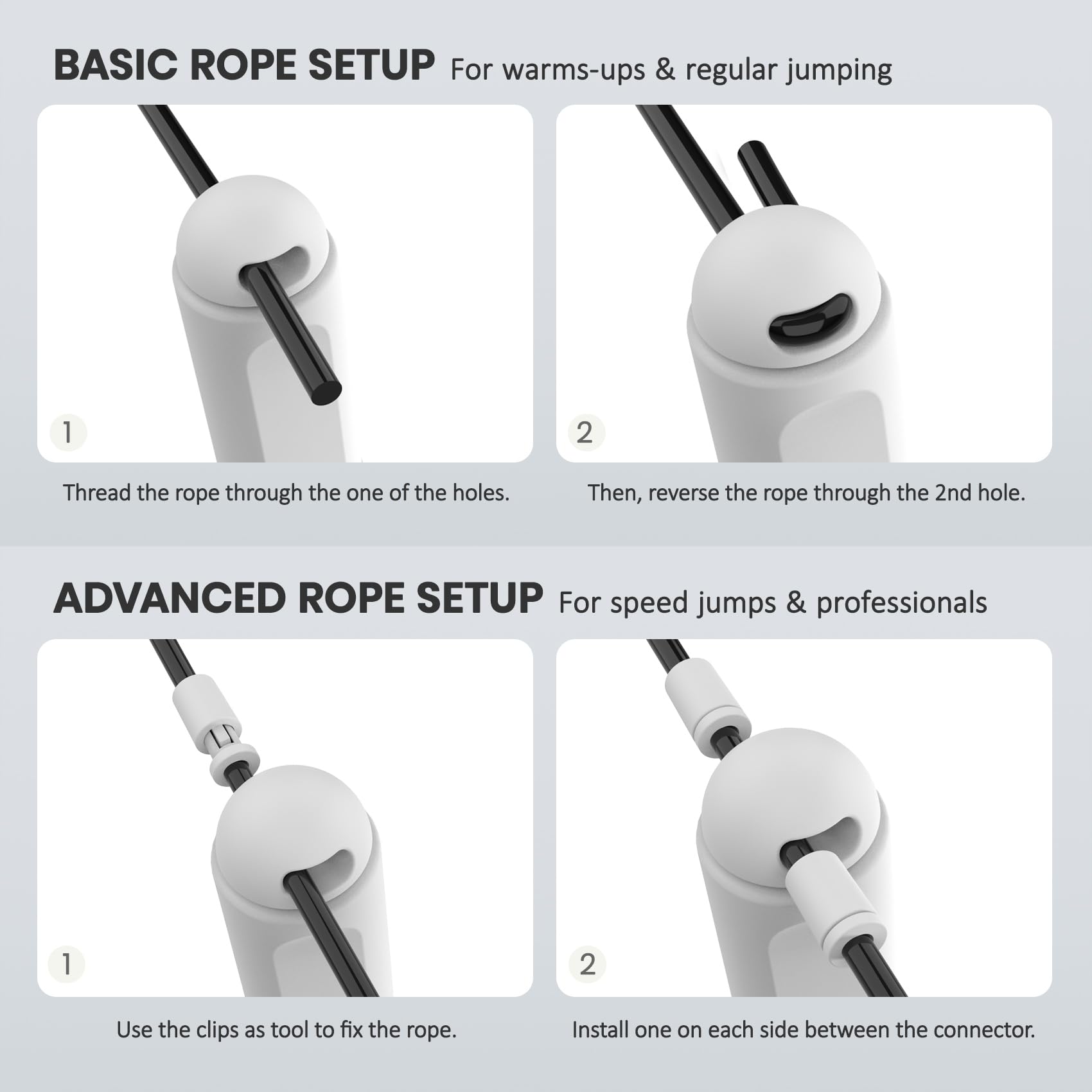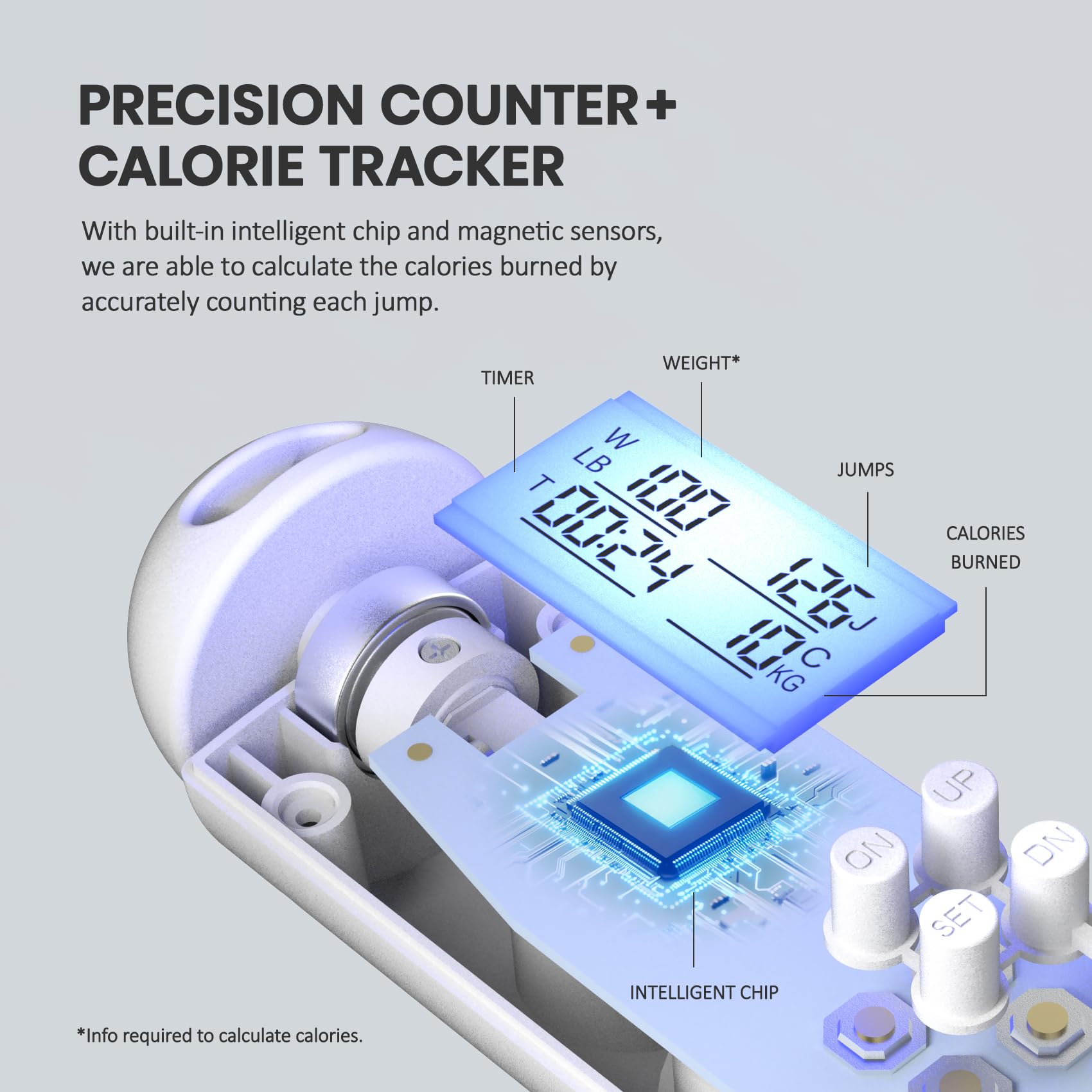 • 【Smart Jump Rope with Counter】Achieve your fitness goals effortlessly with the upgraded jump rope featuring an integrated counter. Simply input your weight and fitness objectives to track real-time data, including timer, calorie burn, and jump counts. Stay motivated and monitor your progress with every session.