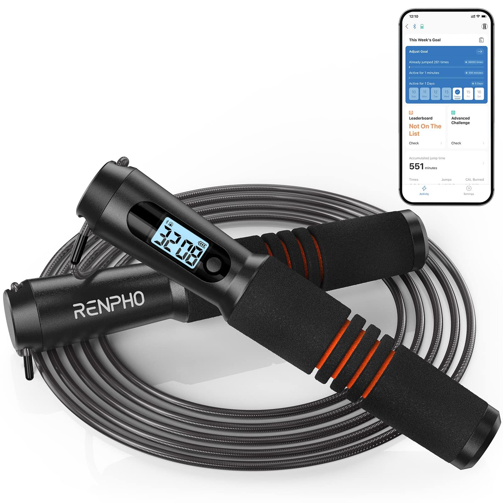 • Reach fitness goal with APP Renpho Health: Our fitness skipping rope can connect with our APP Renpho Health that can easily analyze and track your periodic workout data. You can grasp your skip time, total skip number, calories burned, and tangles to reach your fitness goal at any time.