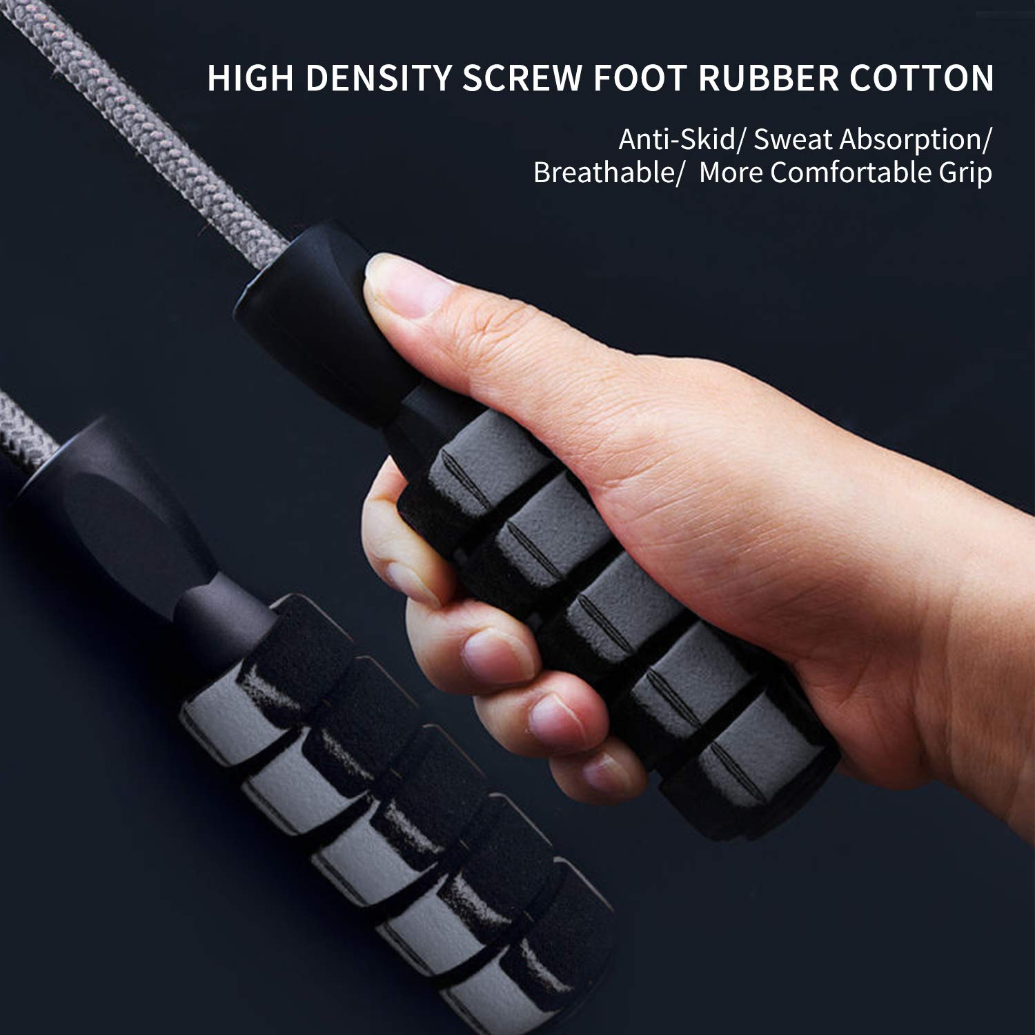 Comfortable & No More Tangling - The light weight ergonomic handles are made of memory foam, soft and comfortable, 6.1 inches long and 1.38 inches in diameter. High quality double ball bearings system avoids the twisting or winding like other fitness ropes, ensure smooth and rapid speed rotation.