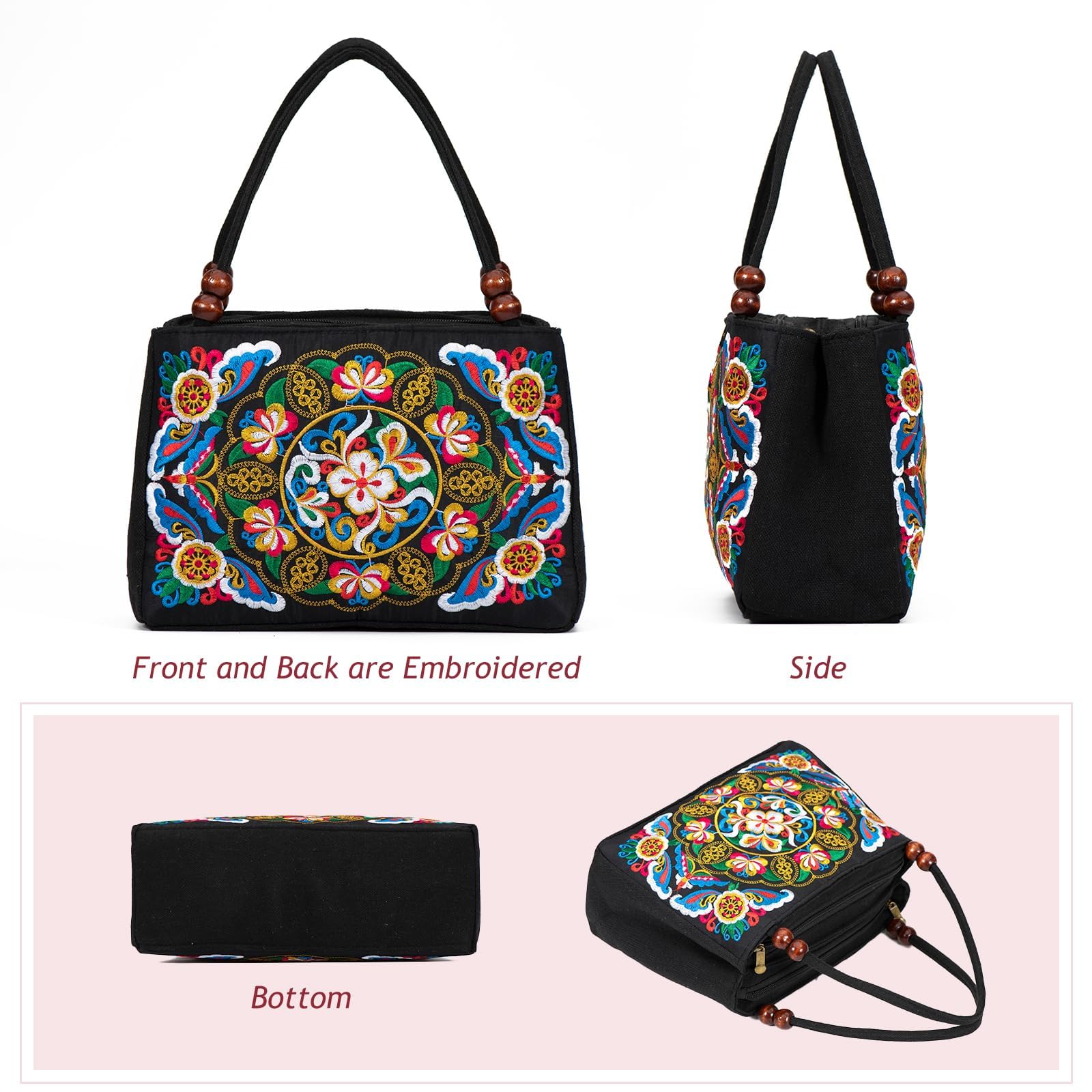 Jursccu Double-Sided Embroidery Totes Bag Travel Beach Bag Vintage Embroidery Ethnic Shoulder Bags