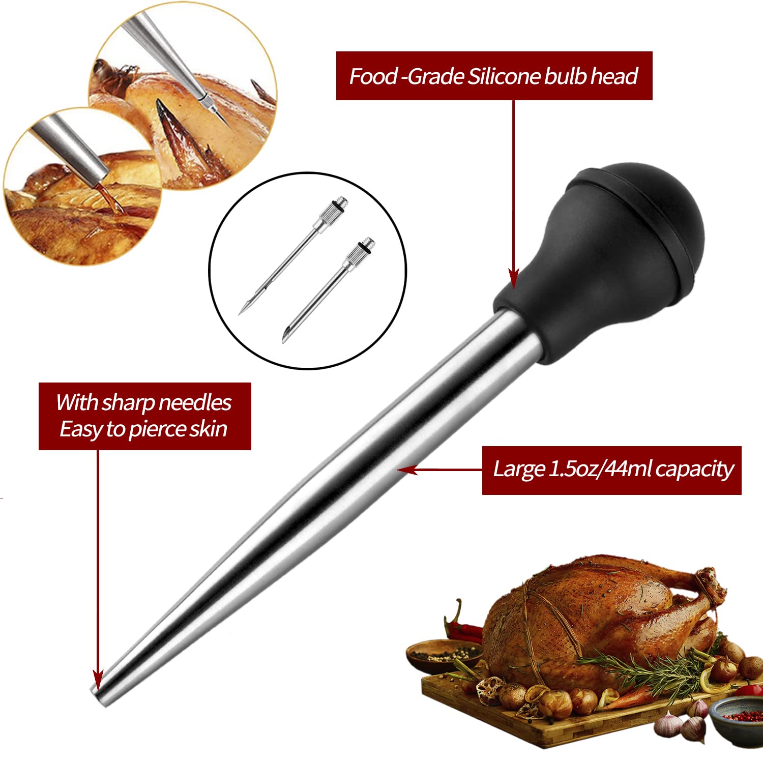 • BASTERS FOR COOKING - Our turkey baster set includes 1 pcs stainless steel turkey baster, 2 pcs baster syringe needles and 1 pcs cleaning brush,used for cooking and BBQ. Prior to baking or grilling, attach the needle included to inject and infuse flavorful juices into your roasts and cuts of meat. You also can remove the excess grease with this food baster.