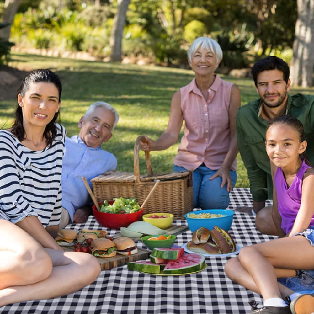 • EASY TO GO & COMPACT DESIGN: The extra large picnic blankets have two size avaliable. The 80' x 80' size can hold 4-6 adults and the size is down to 11' x 7.5' x 2.3' after folding. The 60' x 80' size can hold 2-5 adults and the size is down to 11' x 7.5' x 1.5' after folding. It is portable and lightweight (about 2lbs. to 2.8lbs.) to carry out with built-in handle.