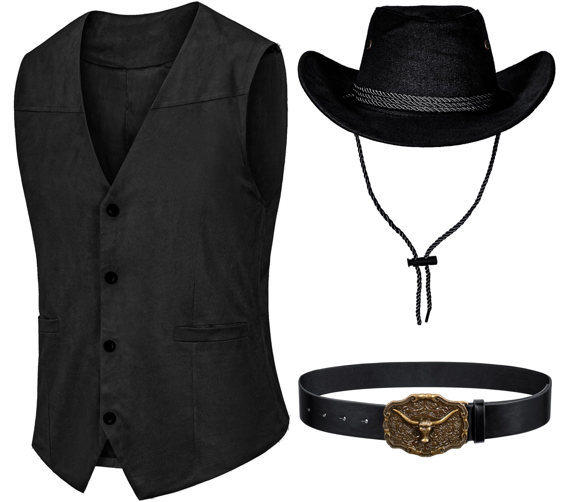 KAIPUTE Western Cowboy Costume Men's Vest Hat Belt for Adult Halloween Party Cosplay Black