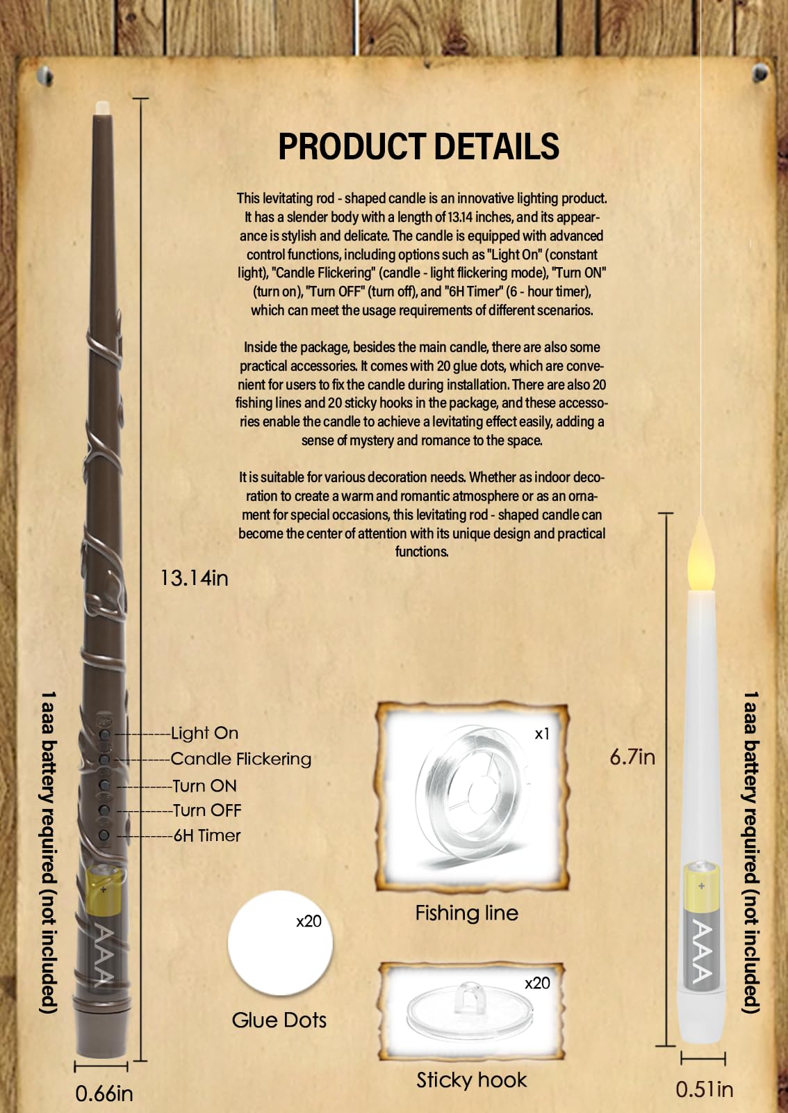 • 【Packaging includes】:Each floating candles and the wand remote both require 1 AAA battery(not included),Each set contains 20 pieces of 0.51'(D)×6.7'(H) LED candles,1*wand remote control, 20 *sticky hooks,1*roll of fishing line.