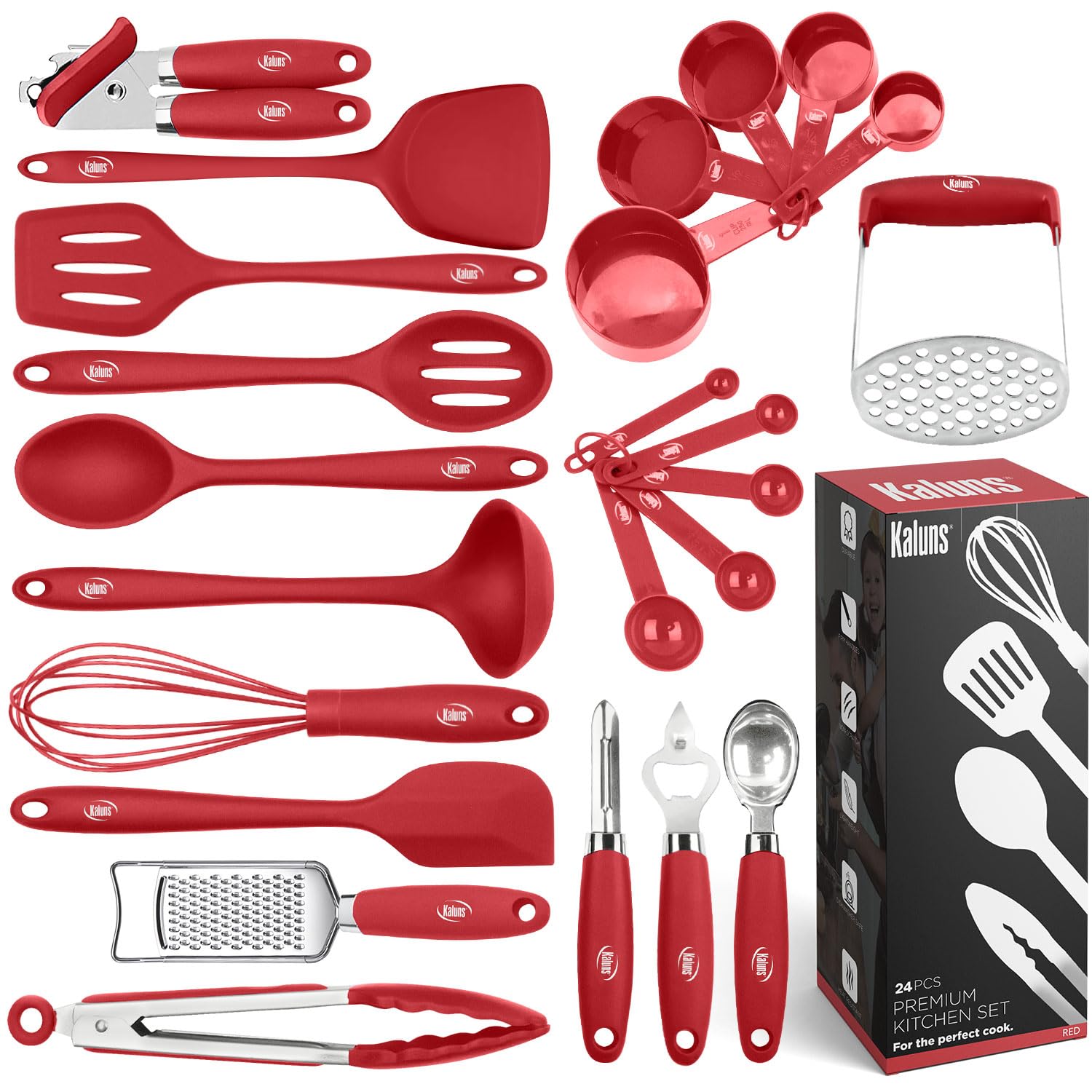 Kaluns Silicone Kitchen Utensils Set 24 Pcs Silicone Cooking Utensils Set - Can Opener, Masher, Turner, Spatula 446°F Heat Resistant Non-Stick - Premium Silicone and Stainless Steel Utensil Set