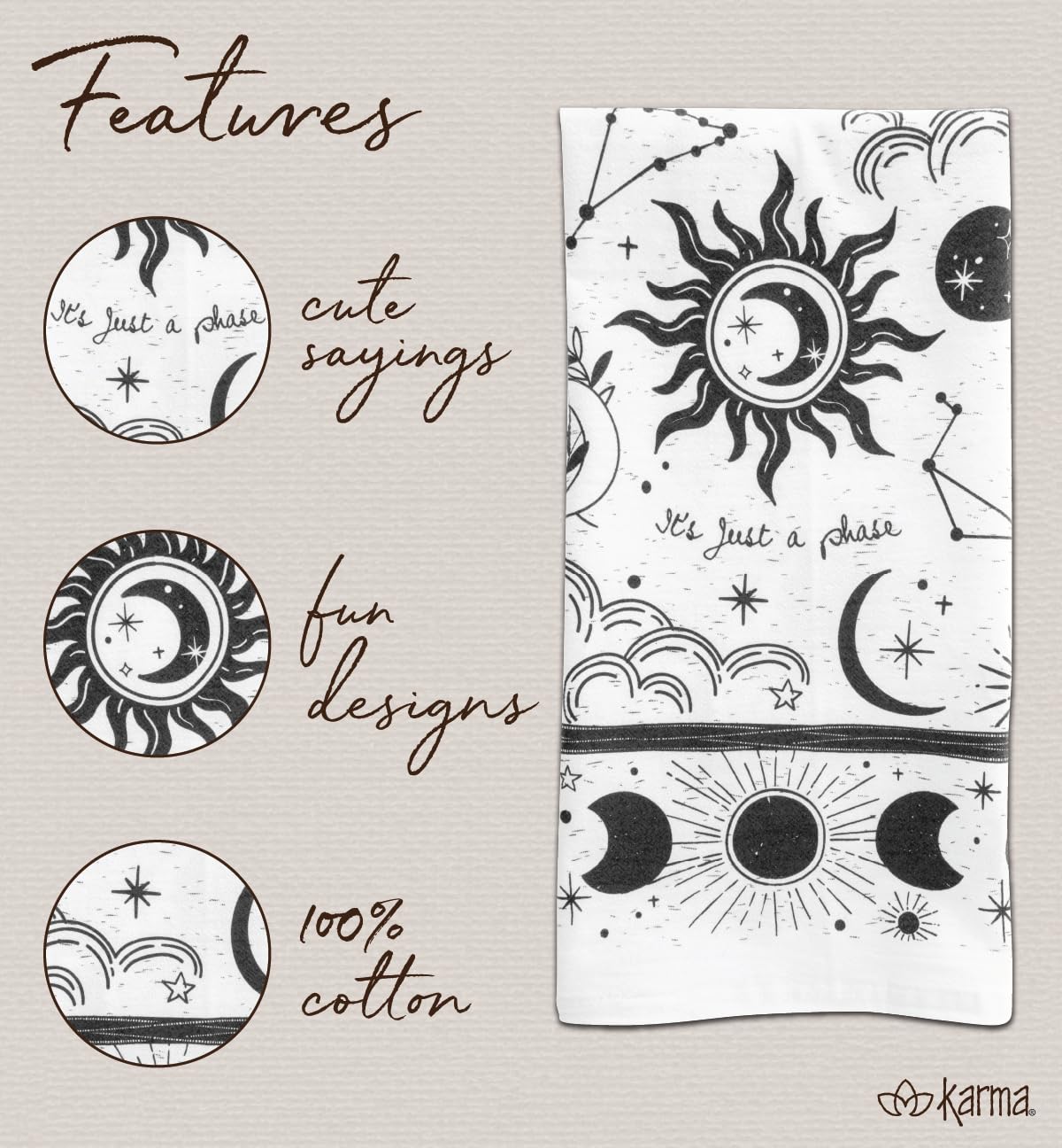Details: Add a touch of bohemian chic to your kitchen and decorate with this collection of durable black and white boho tea towels. The perfect match to our boho mug collection, these tea towels will help you wipe away any kitchen spills while still decorating in style. These machine washable tea towels add a subtle element of whimsy to the kitchen. Available in a multitude of designs to mix and match!