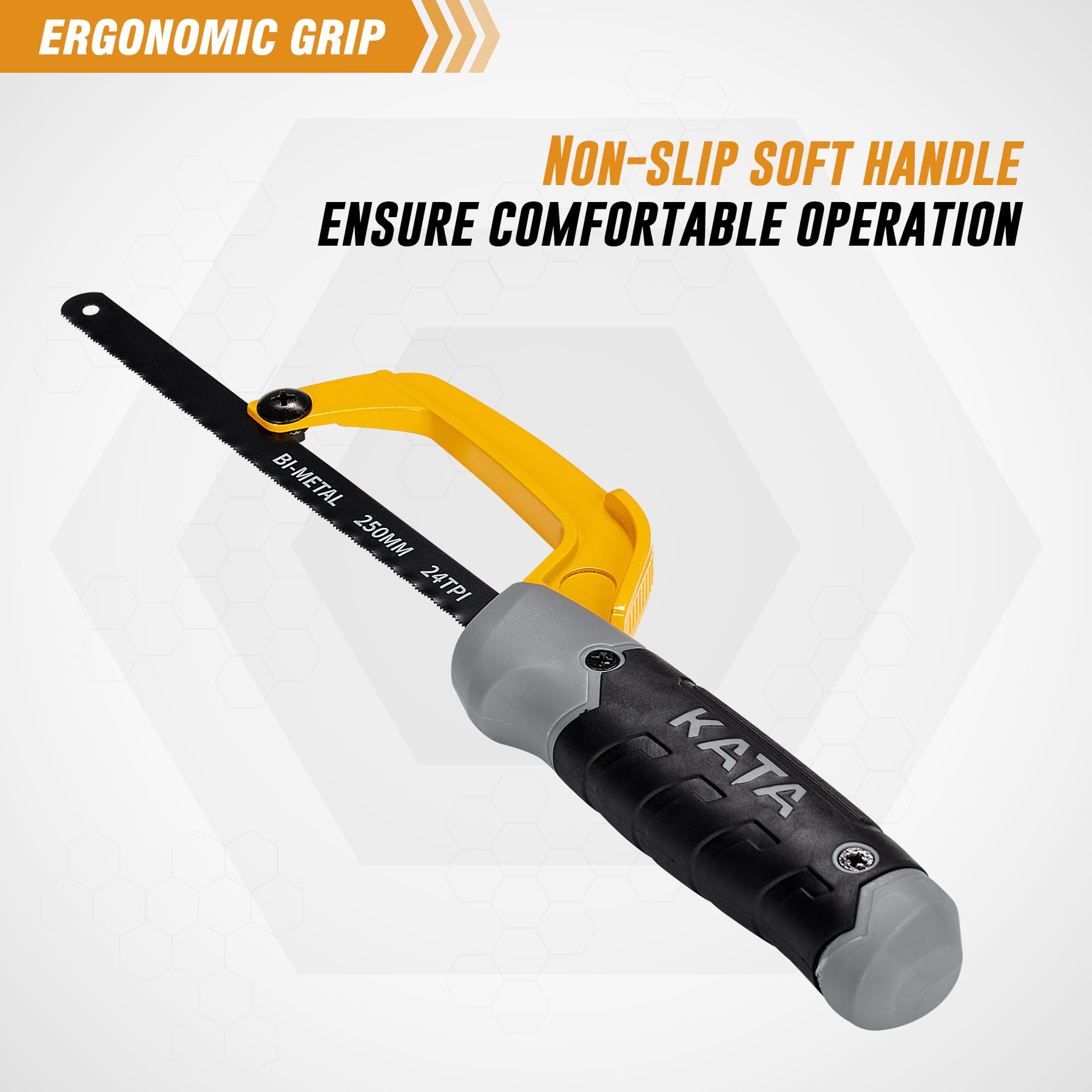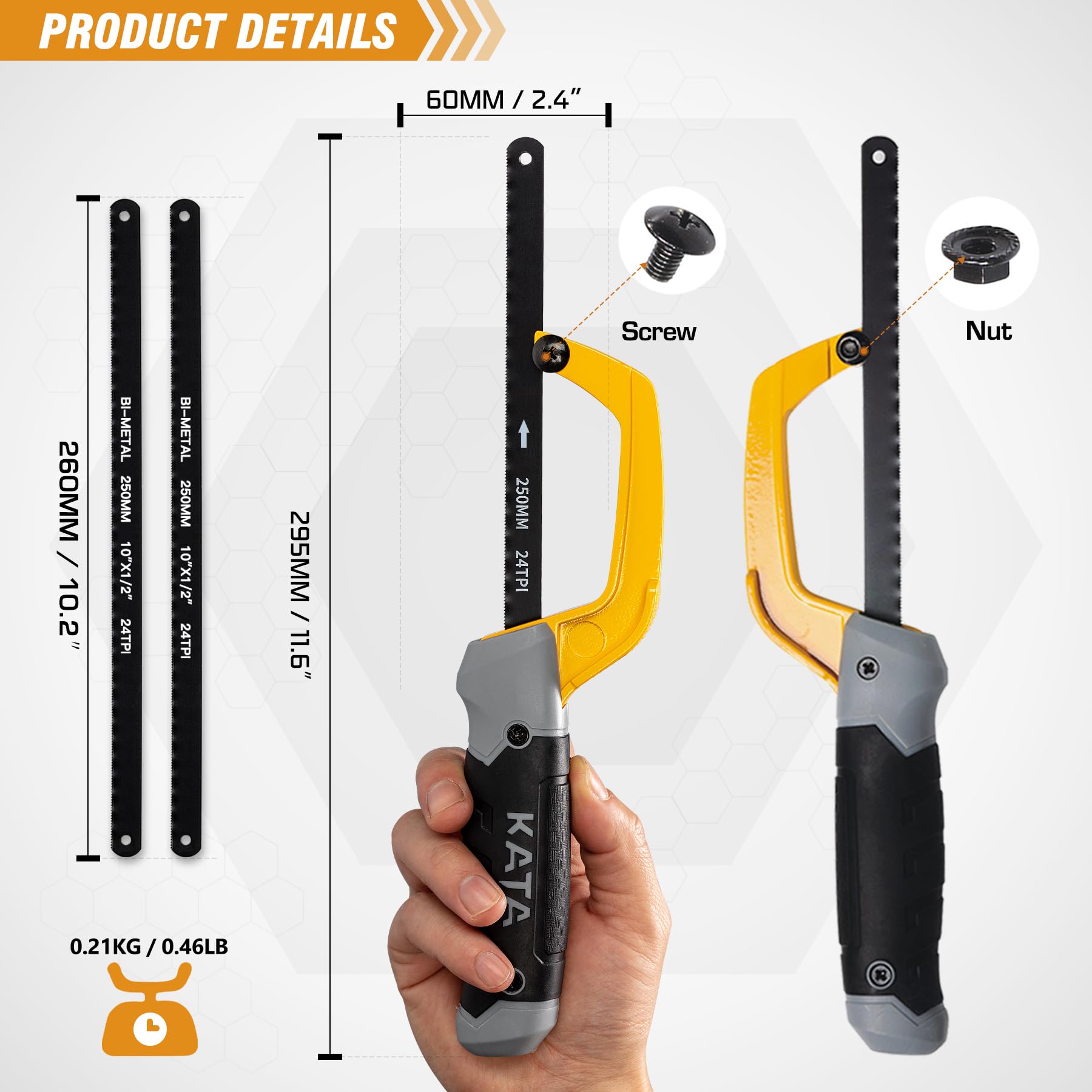 KATA Hacksaw, Compact Hand Operating Hack Saw with 10 Inch Aluminum Frame and 2 Piece Extra Flexible Bi-Metal HSS Blades, Suitable for Wood and Metal (Mini Hacksaw)