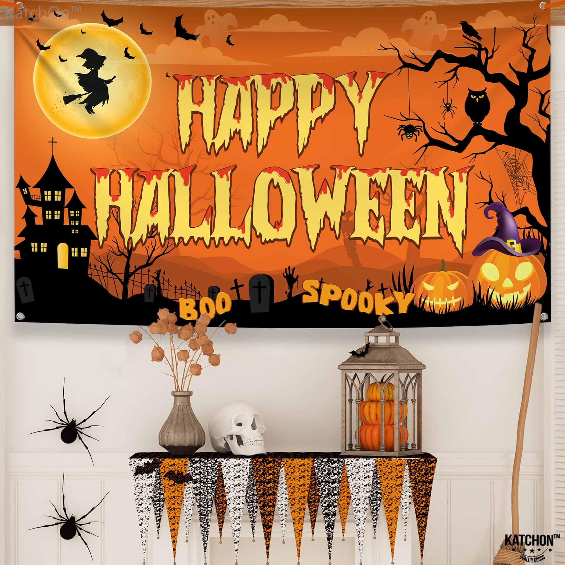 • XTRALARGE SIZE : 72x44 INCH | TRICK AND TREAT THIS HALLOWEEN : Welcome the most thrilling season of the year with the XtraLarge Boo Happy Halloween Banner, a captivating masterpiece that exudes the spirit of Halloween in every inch! This 72x44-inch XtraLarge outdoor halloween banner is the ultimate spooky party essential that will transform any space into a spine-chilling Halloween wonderland. Transform your home or party venue into a haunted wonderland that will leave your guests in awe.