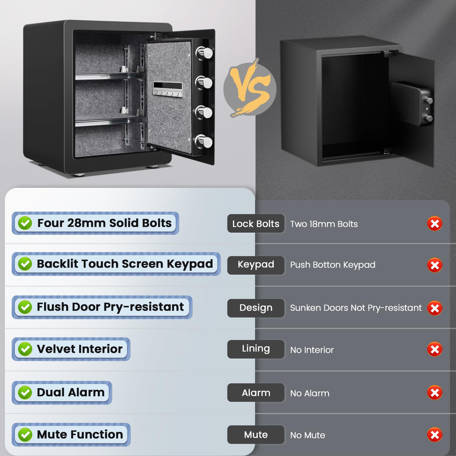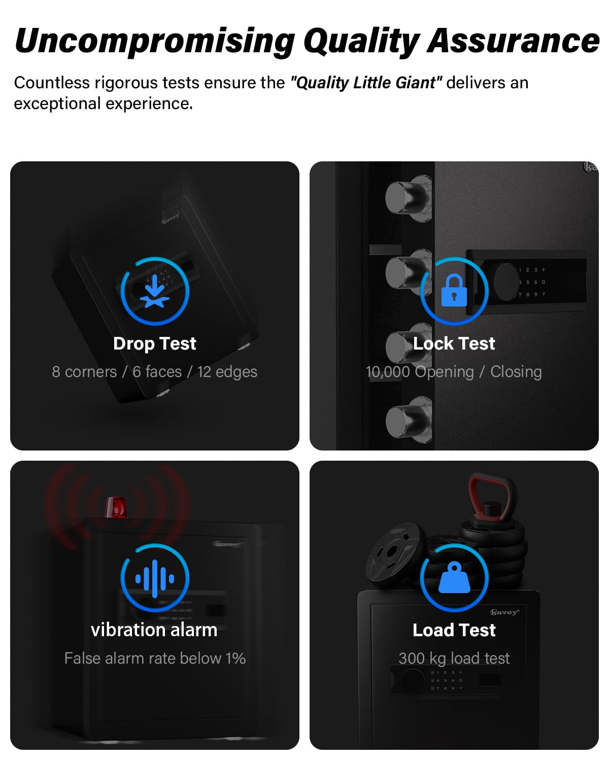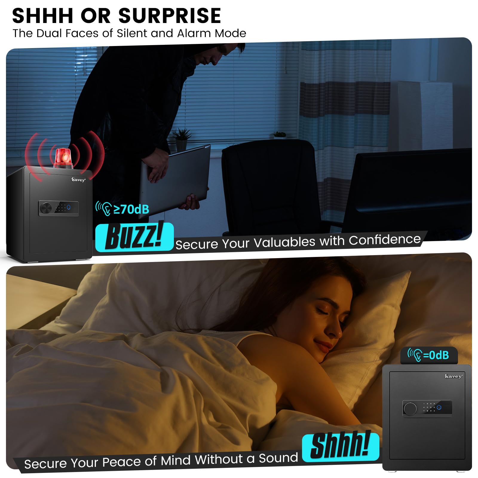 • ADVANCED BIOMETRIC RECOGNITION, SMART CONVENIENCE - Here's the scoop on the bio fingerprint upgrade: Kavey home safe now features a top-notch high-resolution biometric sensor that can detect details at 650 DPI and unlock in a speedy 0.1 seconds. Plus, it can store up to 20 different fingerprints, making it a breeze for multiple users to share access. How impressive is that, right?