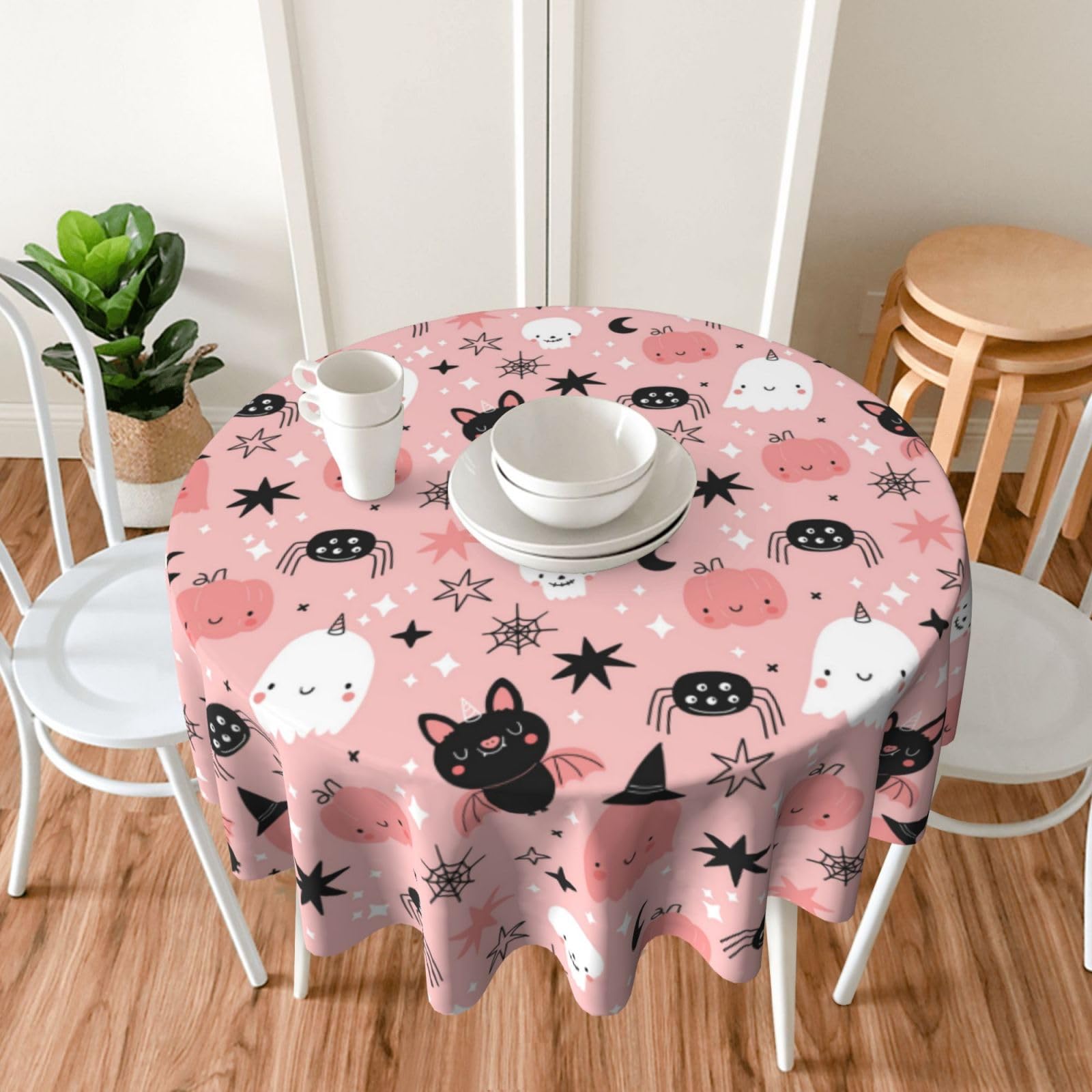 Kawani Halloween Pink Tablecloth Round 60 Inch Cute Ghost Pumpkins Decorative Table Cloth Washable Wrinkle Stain-Resistant Polyester Holiday Table Cover for Party Dinner Picnic Indoor Outdoor