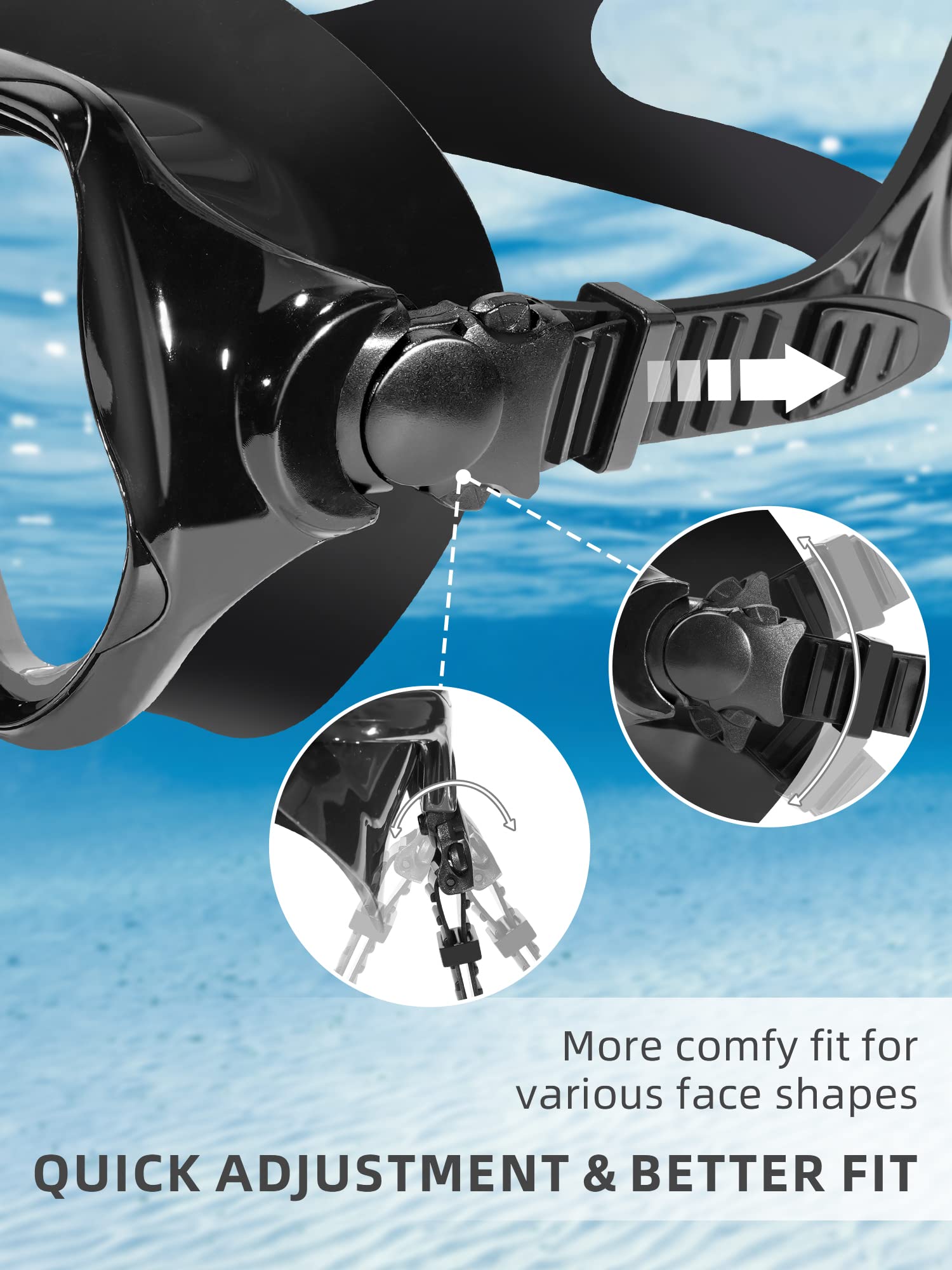 • 🏊‍♀️【Quick Adjustment & Better Fit】Our water mask fit most adult & youth. The straps of scuba diving mask can be adjusted easily by pressing masks' button buckle and pull the mask strap to fit your face and head. The upgraded buttons can be adjusted at different angles which can accommodate varying head sizes for optimum fit and waterproof. Tips to avoid the leakage: Tighten the mask and then you can feel that the silicone skirt is fully absorbed on your face.