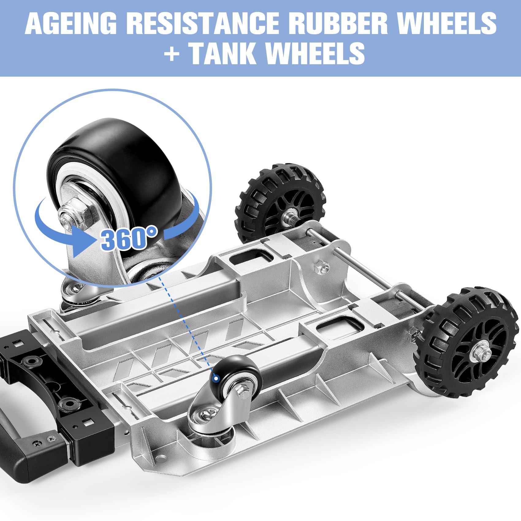 • 【Advanced Tank Wheels】The luggage dolly cart uses upgraded tank wheels, which are 3 times more durable than other rubber wheels on the market, with a stronger grip, no noise, and long service life. Easier to walk over uneven floors. Increased capacity and stability for loading heavy loads