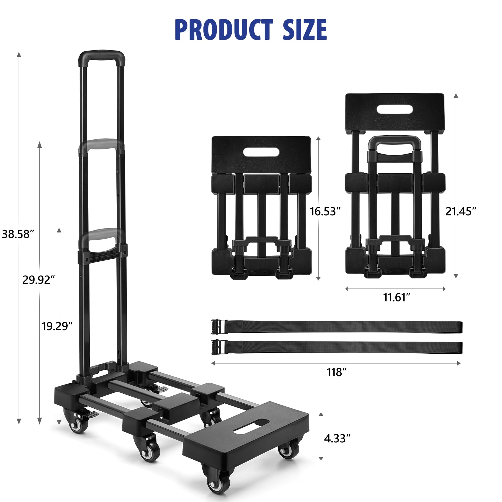 • 【Free 2 Zinc Alloy Buckle Lashing Straps】This folding hand truck comes with 2 pcs thickened zinc alloy buckle lashing straps, you can adjust the length freely.when carrying large-size boxes and travel car seat, and ensures them won't slip off and not roll over when transporting