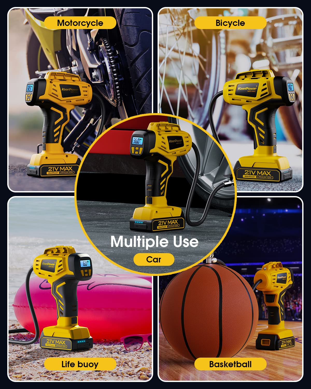 KeenPower Tire Inflator Portable Air Compressor - 2X Faster - 21V Rechargeable Battery Powered Handheld 160PSI Tire Inflator, Dual Power Supply Modes, Air Pump for Car Motorcycle E-Bike