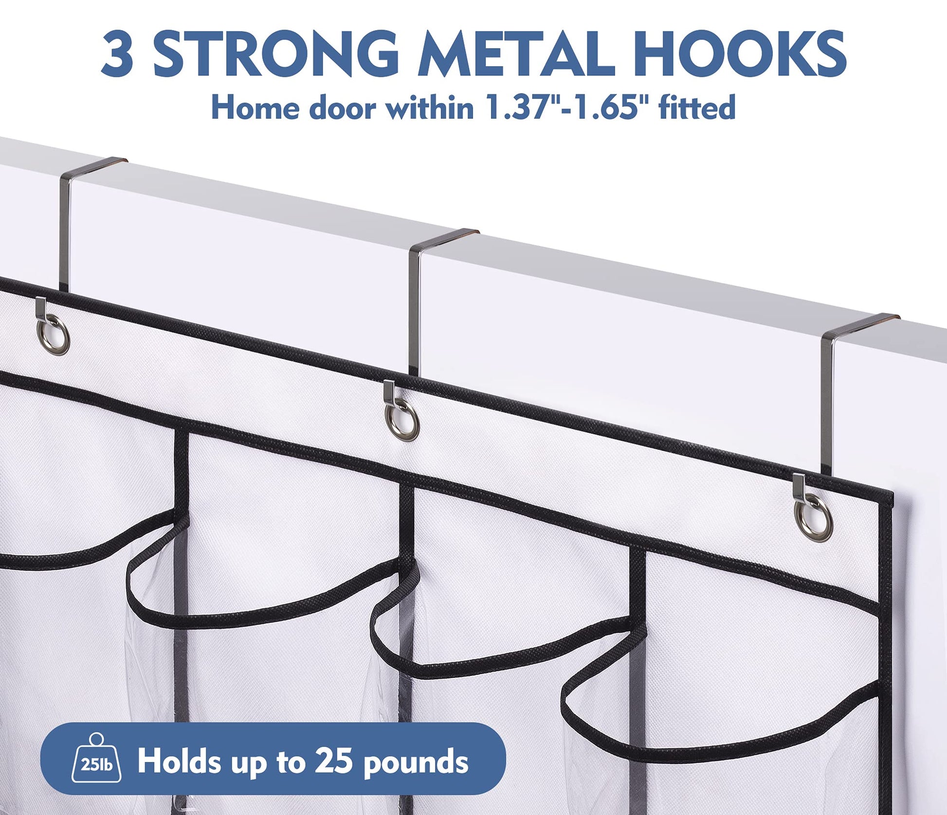 • Strong Bearing: Comes with 3 over the door metal hooks, easy to install on a home door, the maximum width of door that fits the hook is 1.65 inches. The shoe door rack organizer could hold up to 25 pounds and doesn't sway or tilt easily when hanging on a high door;