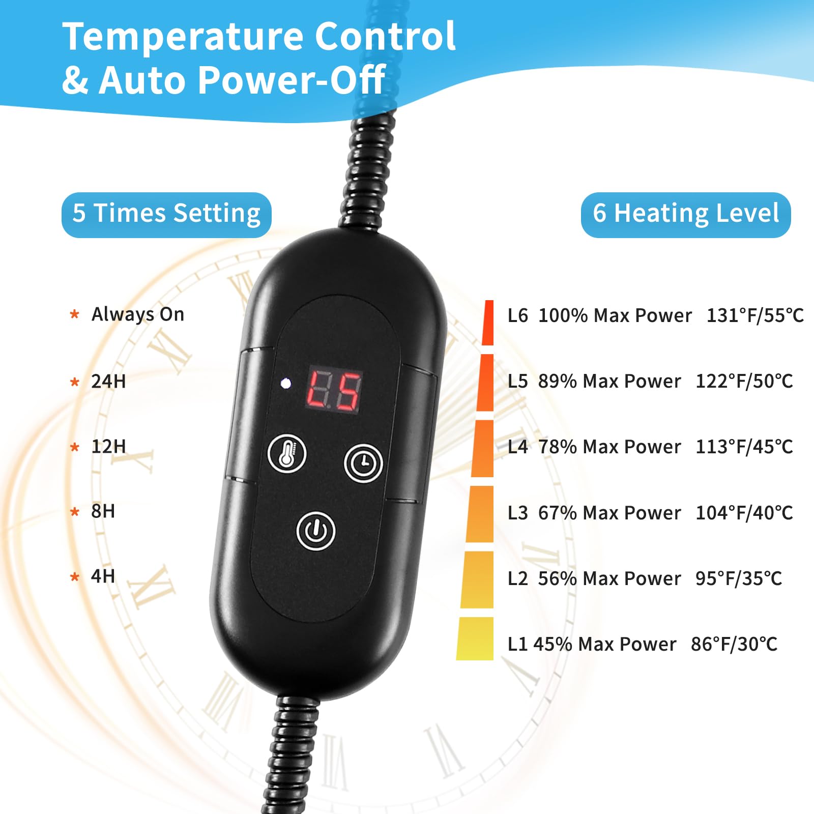 • 【Temperature Controller】Controlling the temperature of electric dog heating pad with temperature controller, it can adjust the temperature easily with 6 temperature settings ( 30℃/86℉~55℃/131℉) to accommodate your pets. High setting is for heating the dog mat,and it should be used at LOW setting for long periods.The Electric Heating Mat for Dog House keeps pet steady warm at night time