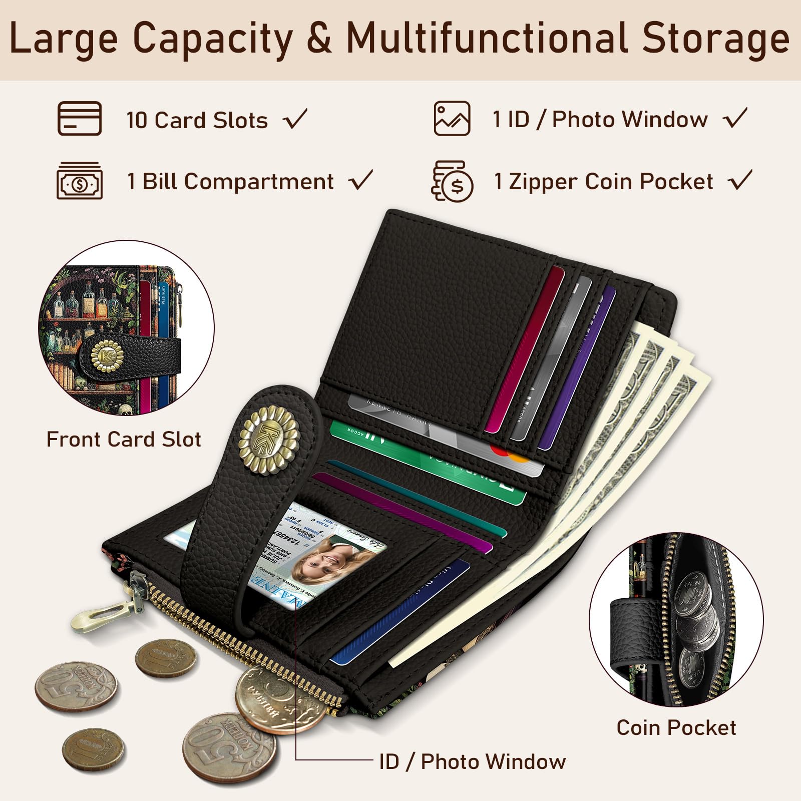 • Stylish Bifold Design: Printed with bookshelves, skulls, books, flowers and glass bottles, this goth skull wallet features a secure bifold structure for effortless portability; Its small profile fits into pockets, purses, or clutch bags, offering versatile functionality for work, events, dating or casual outings; A minimalist yet fashionable credit card wallet for every occasion