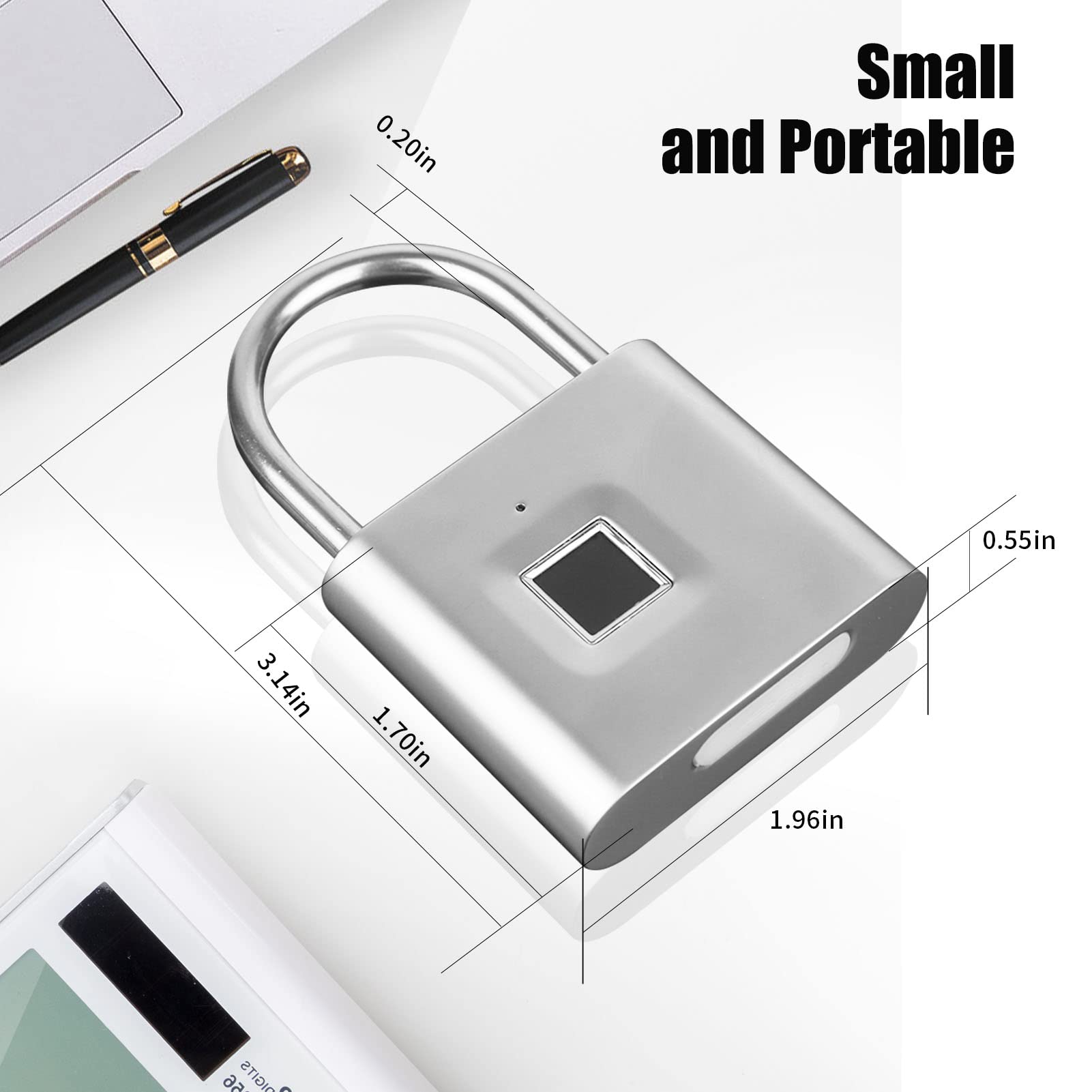 Details: Convenient Fingerprint Padlock: Simply press your finger to unlock the door within 0.5 seconds, very convenient, especially for children and the elderly. Up to 2 administrator fingerprints and 48 user fingerprints can be recorded, which can be used with family and friends. Indoor and Outdoor Use Padlock: IP65 waterproof rating, you don't need to worry about using it outdoors. In addition, the exterior of the lock body is made with anti-rust treatment, so you don't have to worry about the lock rusting even if it is in a humid environment for a long time. Low Power Alarm: It takes only 1~2 hours to charge this fingerprint padlock, and it can perform 10,000 unlocking operations after fully charged, with a normal standby time of up to 12 months. When the voltage is ≤3.5V, the red light will flash 3 times after unlocking to remind users to charge in time. You can also use the emergency key to unlock the padlock. Sturdy and Durable: The design of the fully enclosed shell, zinc alloy material to build the lock body, anti-drop and anti-collision, no need to worry about damage caused by bumping, can be used for a long time. Wide Range of Applications:This fingerprint padlock is compact and can be carried around. You can use this fingerprint padlock in many places. Such as gyms, schools, offices, cabinets, toolboxes, bicycles.If you have any unanswered questions about this lock, you can contact us at the first time.1.96*0.55*3.14 inches (about 7.6 * 4.6 * 1.3 cm).