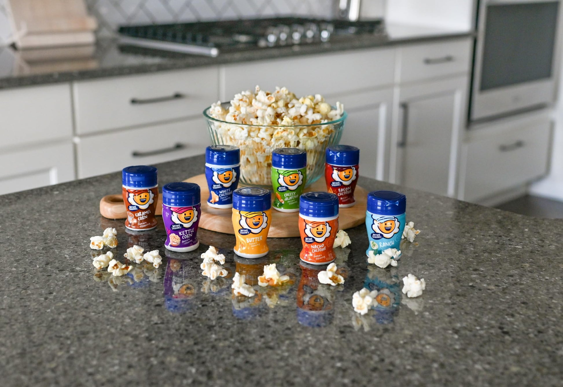 • Variety is the spice of life! Try out all Kernel Season’s Popcorn Seasoning has to offer with 8 mini shakers. Flavors include: White Cheddar, Nacho Cheddar, Ranch, Butter, Kettle Corn, Caramel Corn, Bacon Cheddar, and Cheesy Jalapeno