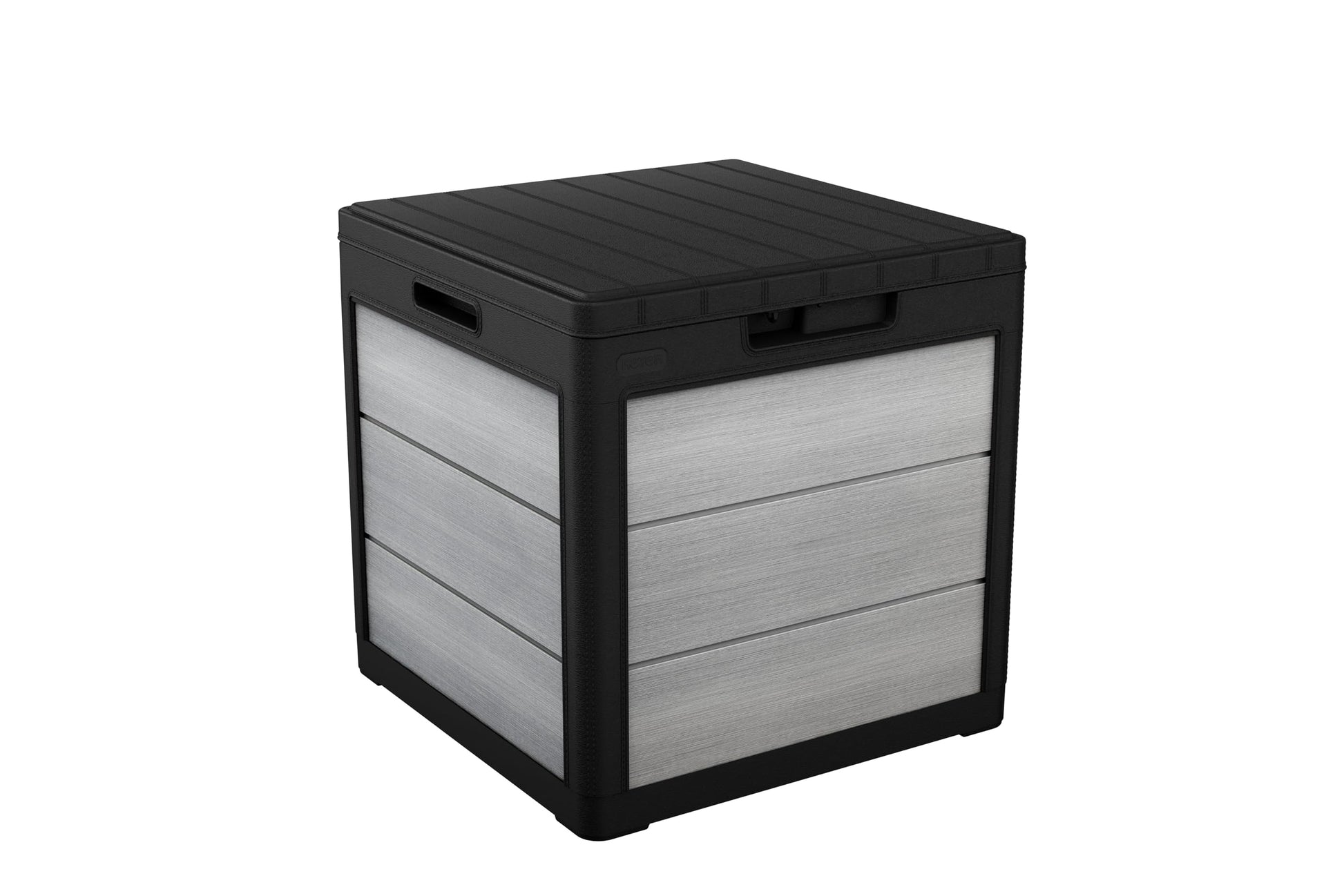 Details: Designed to be both practical and attractive, the 30 Gallon Denali Deck Box features square construction and a rustic wood like texture that allows it to blend in with just about any outdoor living style. This versatile deck box doubles as a patio chair providing additional seating when summertime guests come to visit. It's just the right size to accommodate one adult. The deck box is built with DUOTECH , an innovative material that combines weather-resistance and UV protection.
