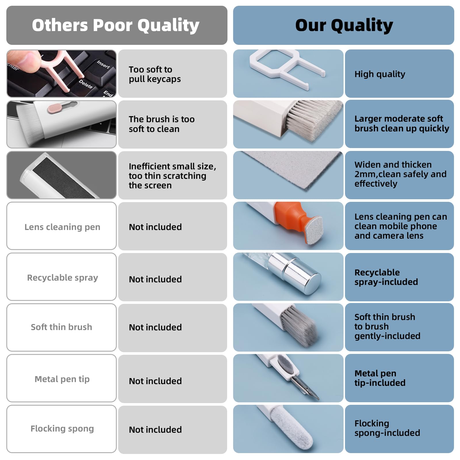 • 【UPGRADED LAPTOP CLEANING KIT 】 The macbook cleaning kit computer screen cleaner comes with a number of accessories including a retractable large brush, polishing cleaning cloth X 2, keycap puller, metal pen tip, flocking sponge, thin soft brush, soft plastic lens cleaning pen, 5 replacing cloth, large cleaning microfiber cloth. You deserve the comprehensive computer cleaning kit keyboard vacuum at a low cost