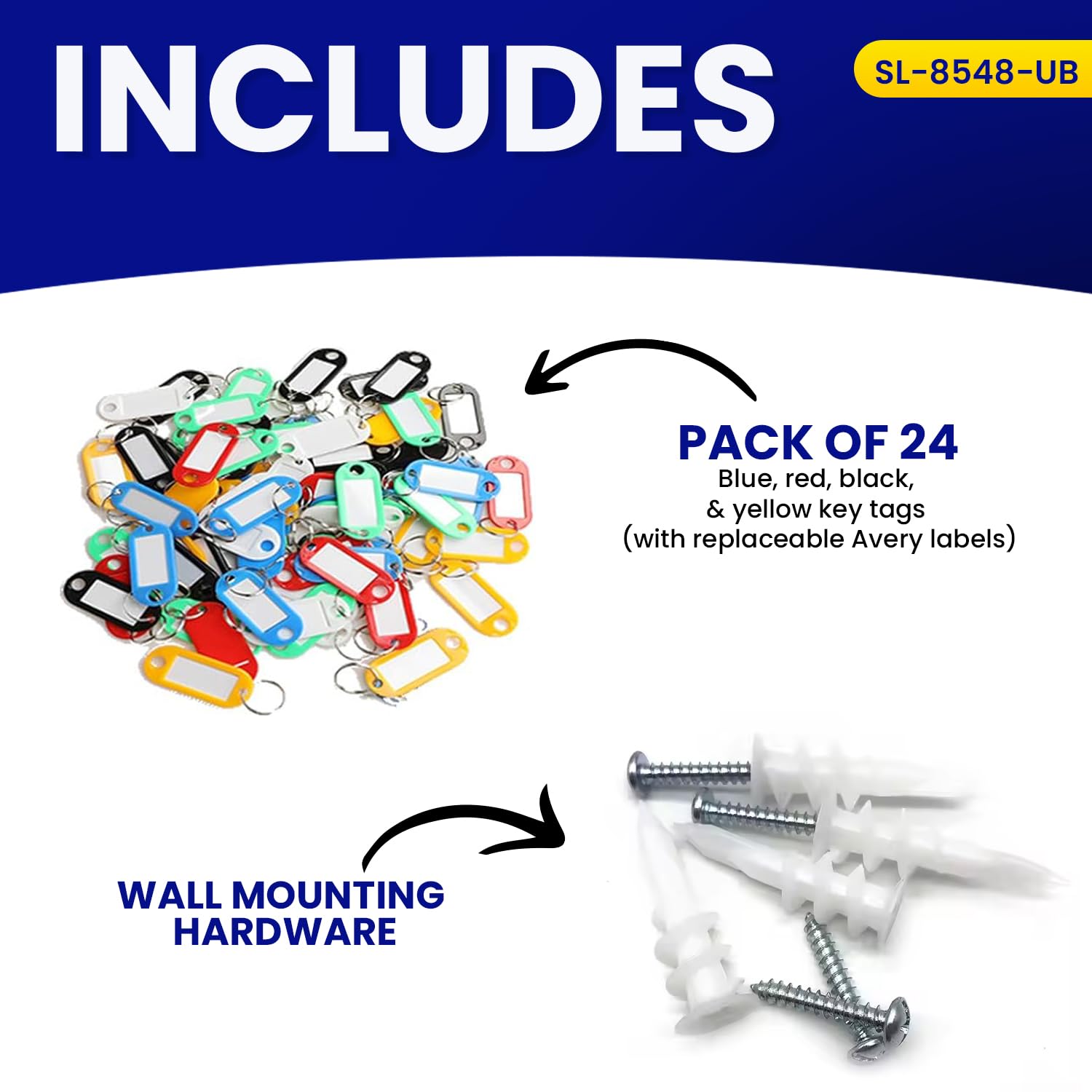 • INCLUDES ACCESSORIES - Every KeyGuard is inclusive of mounting hardware. You won’t need other complicated tools for installation. Plus, it comes with a pack of 24 blue, red, black, and yellow key tags, complete with key rings and replaceable Avery labels, ideal for any standard key ring or key chain, so you can better organize multiple sets of keys hassle-free.