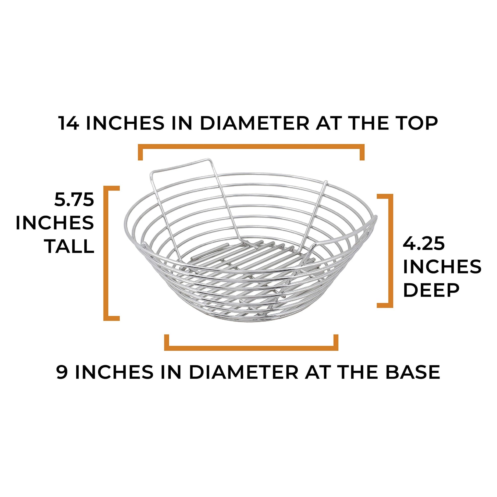 • One Large Kick Ash Basket stainless steel charcoal basket for a Large Big Green Egg Grill; measuring 9 inches in diameter at the base, 14 inches in diameter at the top, 4.25 inches deep, and 5.75 inches tall; also fits Grill Dome & Primo Kamado grills; custom-built sizes available for Big Green Egg, Char Griller, Pit Boss, Primo, Broil King, Kamado Joe, Louisiana Grills, Weber, Grilla Grills, PK Grills, Saffire, Grill Dome, SNS grills, and Vision Grills; no replacement necessary